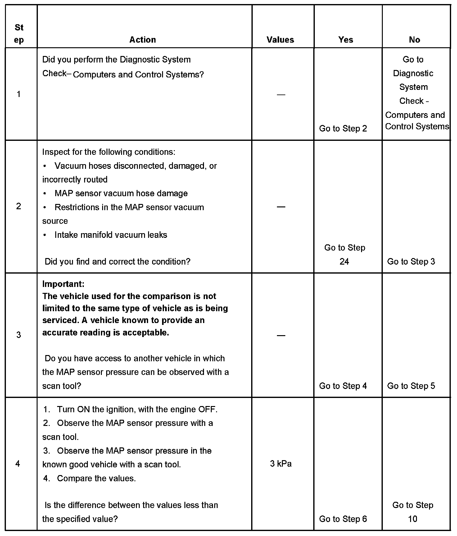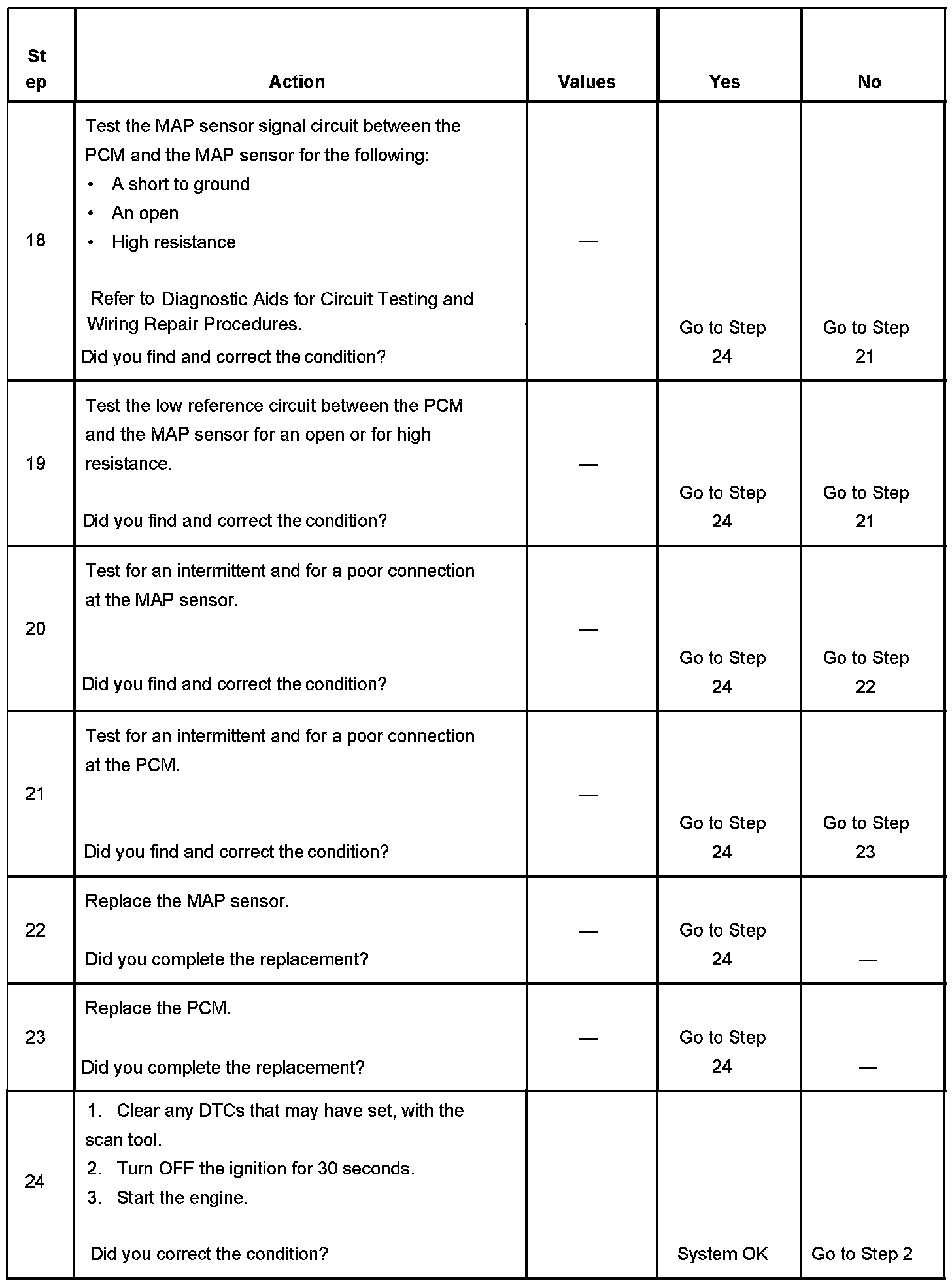 If the PCM detects a MAP sensor signal voltage that is excessively high, DTC P0108 sets. If the PCM detects a MAP sensor signal voltage that is excessively low, DTC P0107 sets