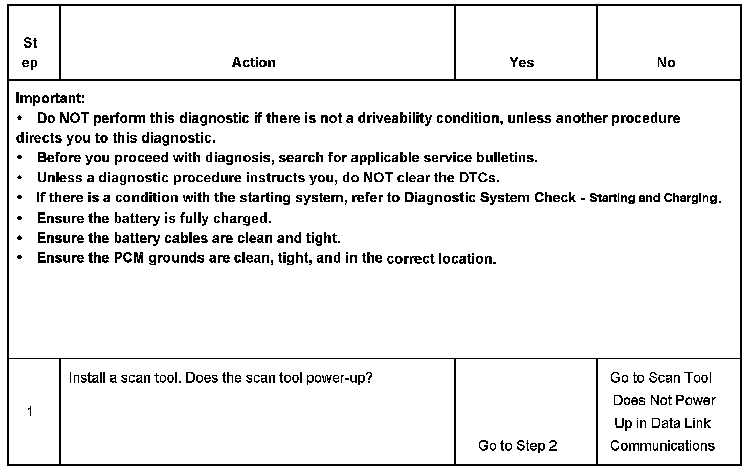 The Diagnostic System Check-Computers and Controls Systems is an organized approach to identifying a condition that is created by a malfunction in the engine control system. The Diagnostic System Check must be the starting point for any driveability concern. The Diagnostic System Check directs the service technician to the next logical step in order to diagnose the concern. Understanding and correctly using the diagnostic table reduces diagnostic time and prevents the replacement of good parts.
