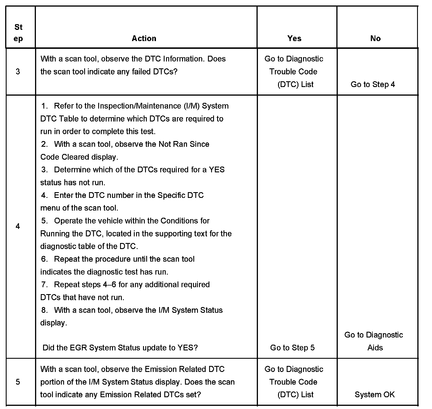 3. This step is to identify a first failure of a type B DTC. A DTC only appears on the I/M System Status display when it becomes a MIL illuminating DTC. This occurs on the second failure of a type B DTC. A first failure of a type B DTC will not allow the I/M System Status to update to YES. Refer to Diagnostic Aids.
