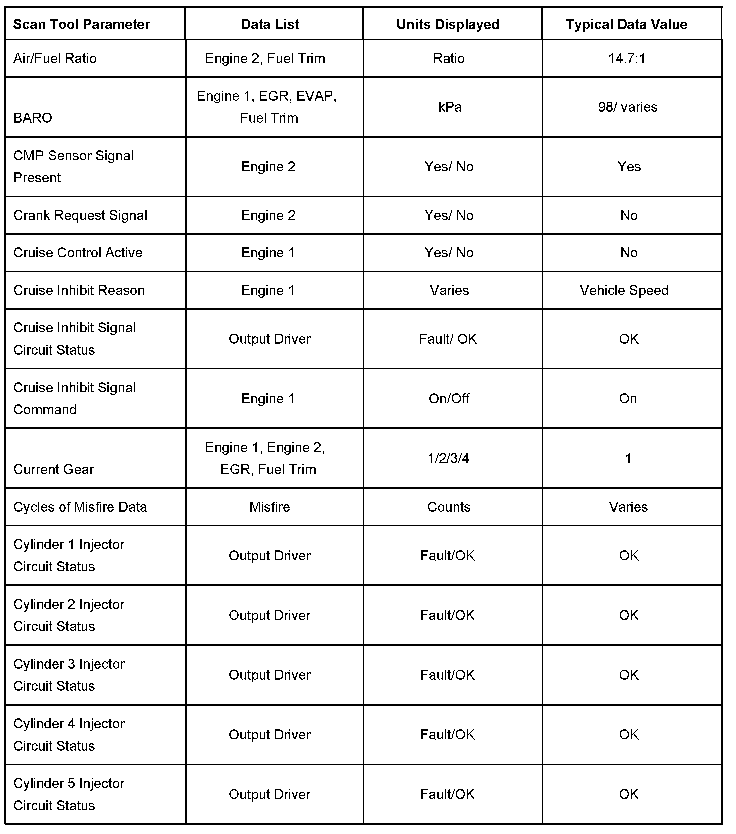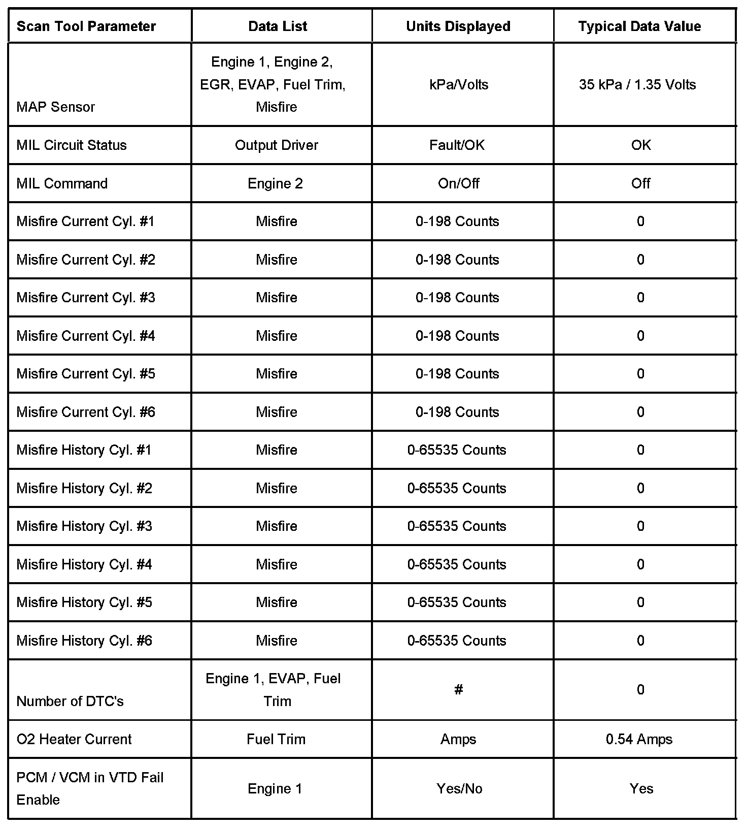 - Misfire Data - Contains information specific to the misfire diagnostics and parameters required to verify proper operation with regard to misfire.