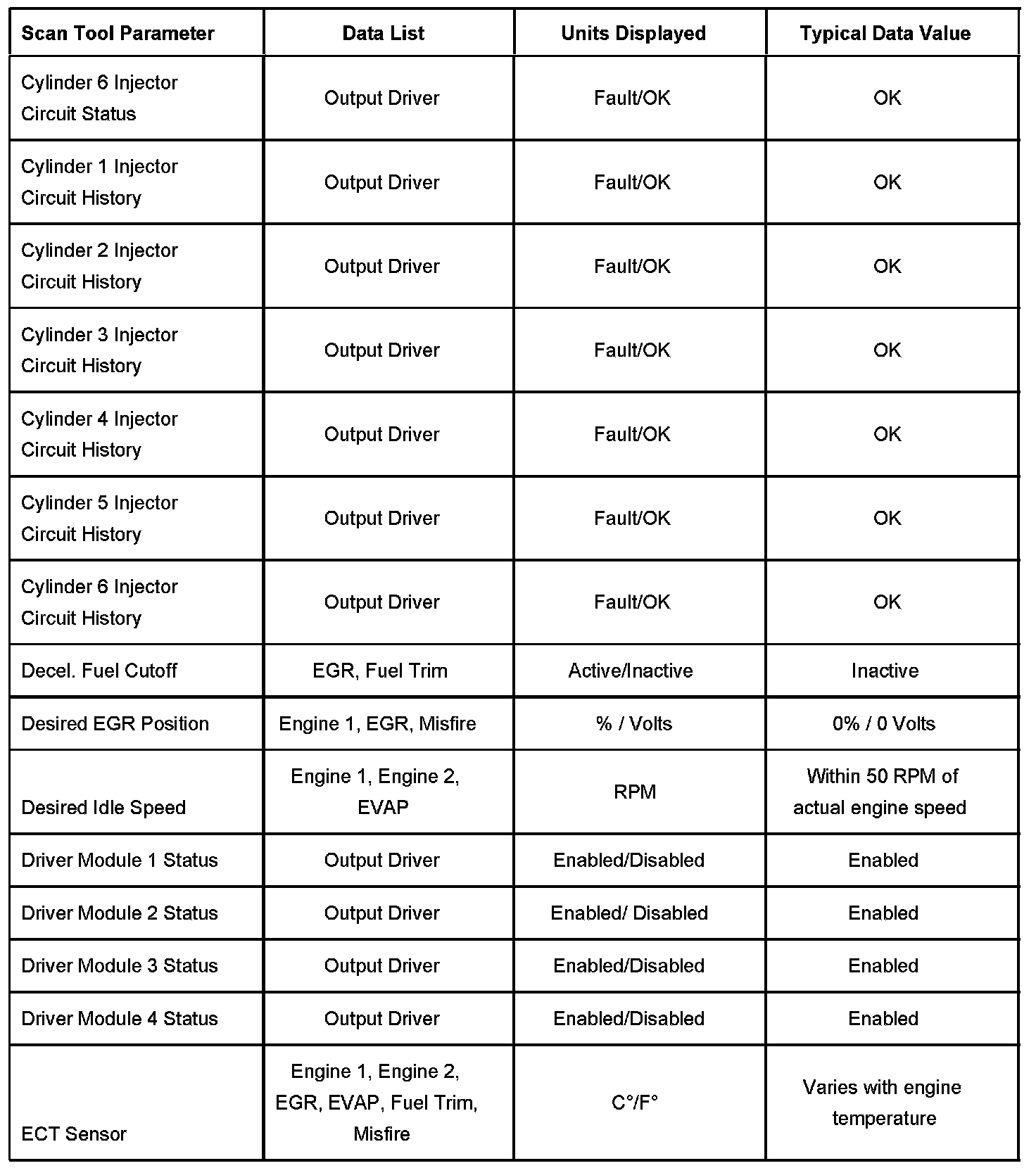 - EGR Data - Contains information specific to the exhaust gas recirculation (EGR) system. This list displays parameters required to verify proper EGR system operation