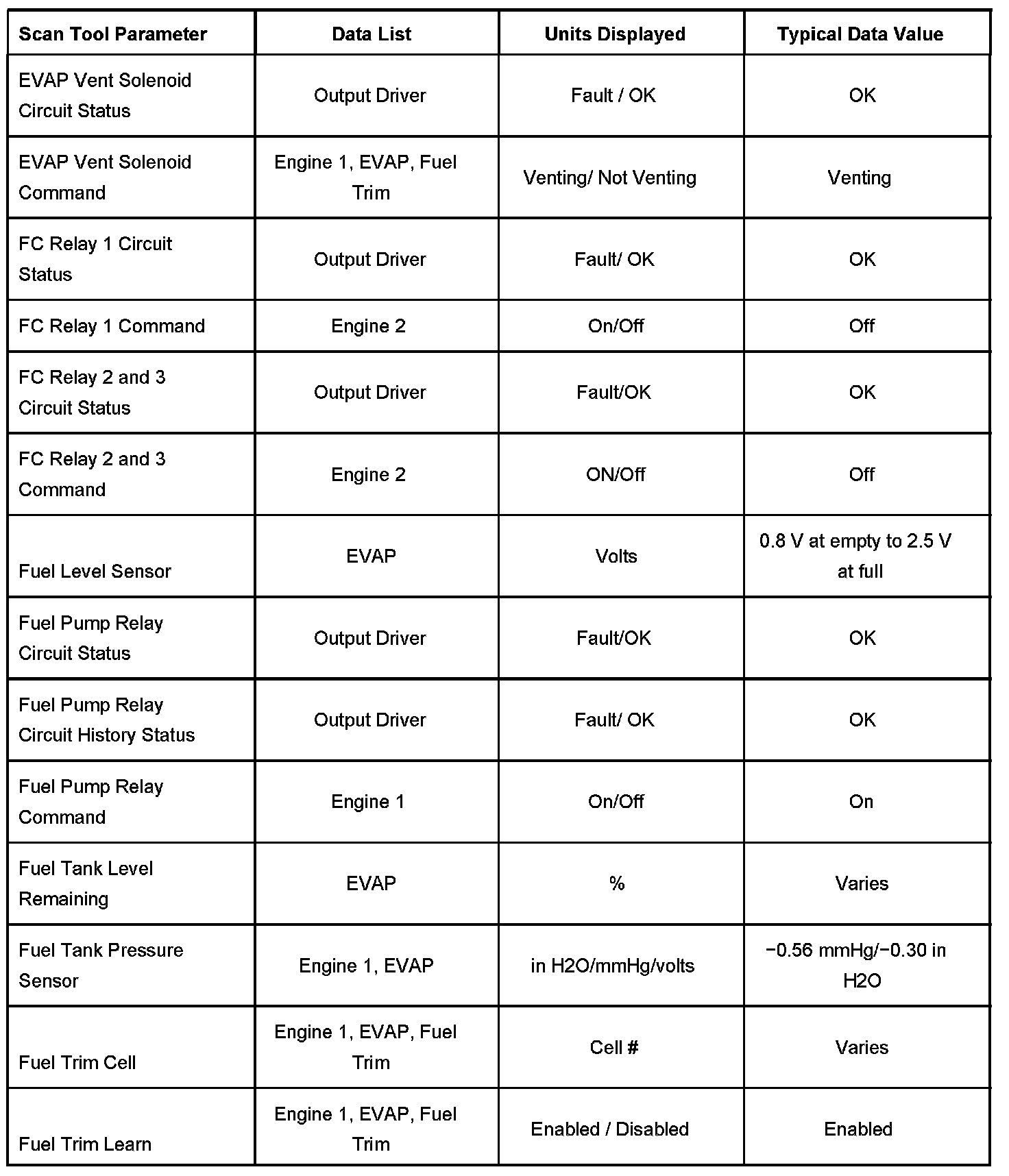 - Fuel Trim Data - Contains information specific to the fuel trim operation. Also displays parameters required to verify proper fuel trim operation.