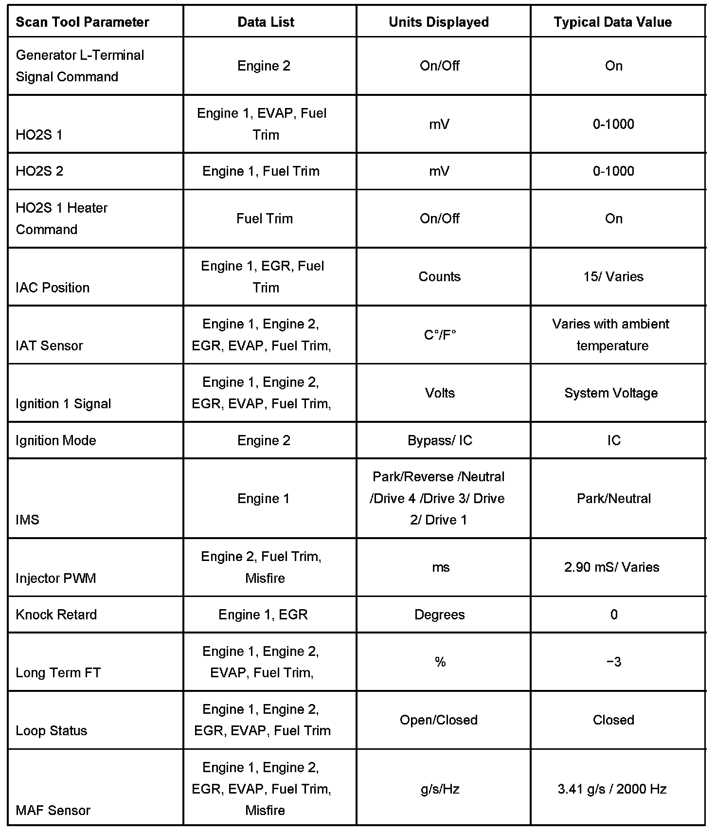 - Engine Data 1 - Contains general information regarding fuel delivery, idle air control (IAC) position, heated oxygen sensor (HO2S 1), HO2S 2, and other basic engine operating conditions.
