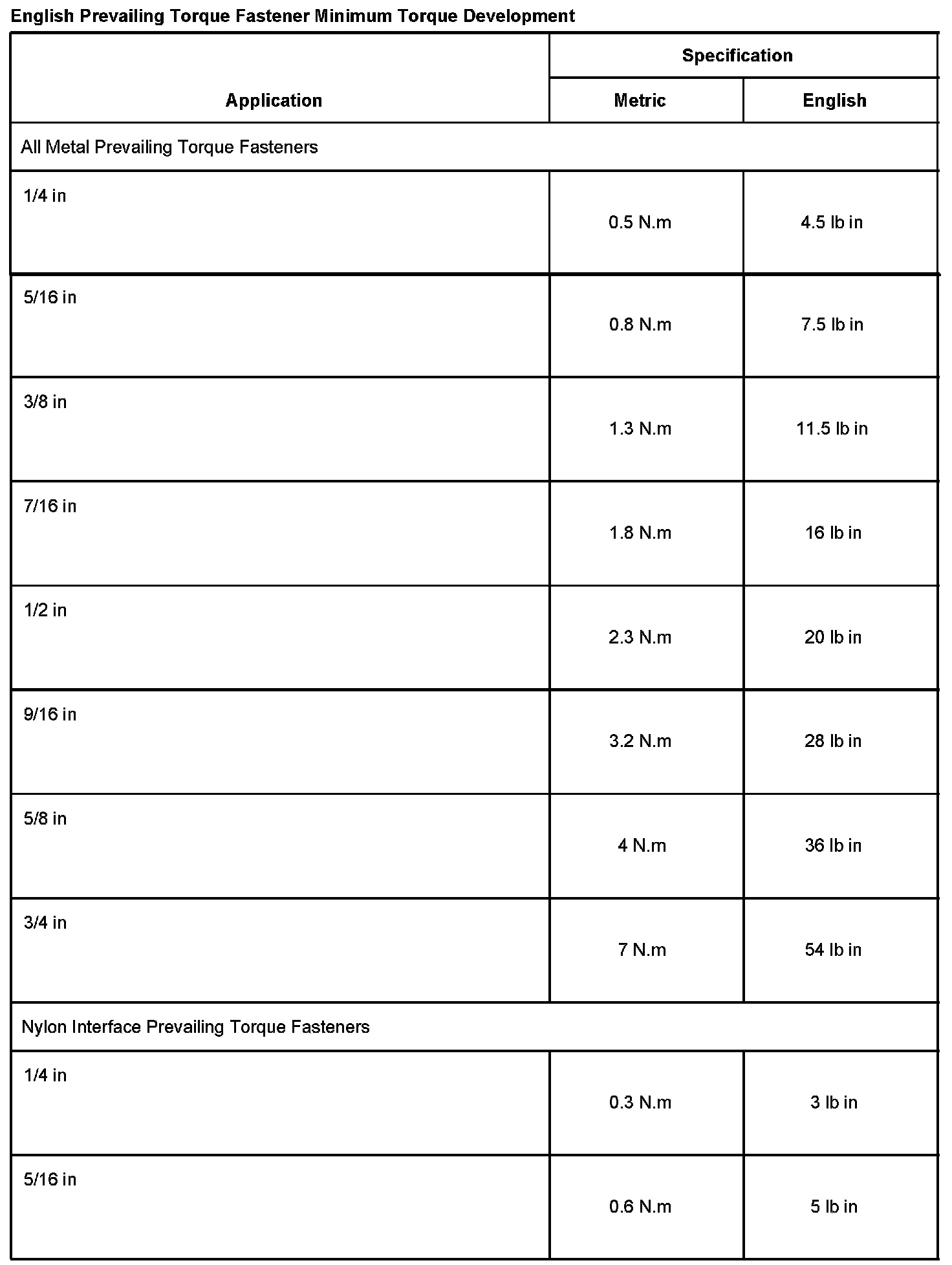 ENGLISH PREVAILING TORQUE FASTENER MINIMUM TORQUE DEVELOPMENT