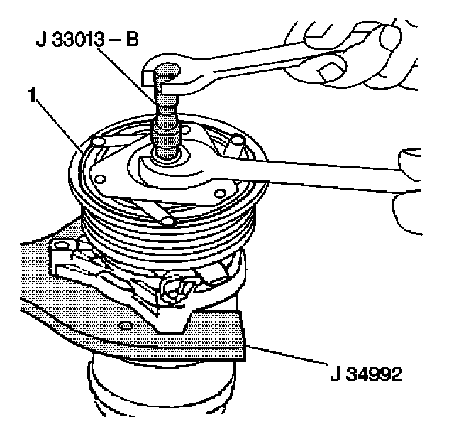 5. While holding the body of J 33013-B of the remover with a wrench, turn the center screw into the remover body in order to remove the clutch plate and hub assembly (1).