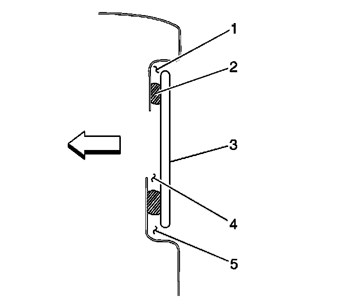 6. Use body color paint and apply to any scratches exterior (1, 5) of the urethane adhesive bead (2).