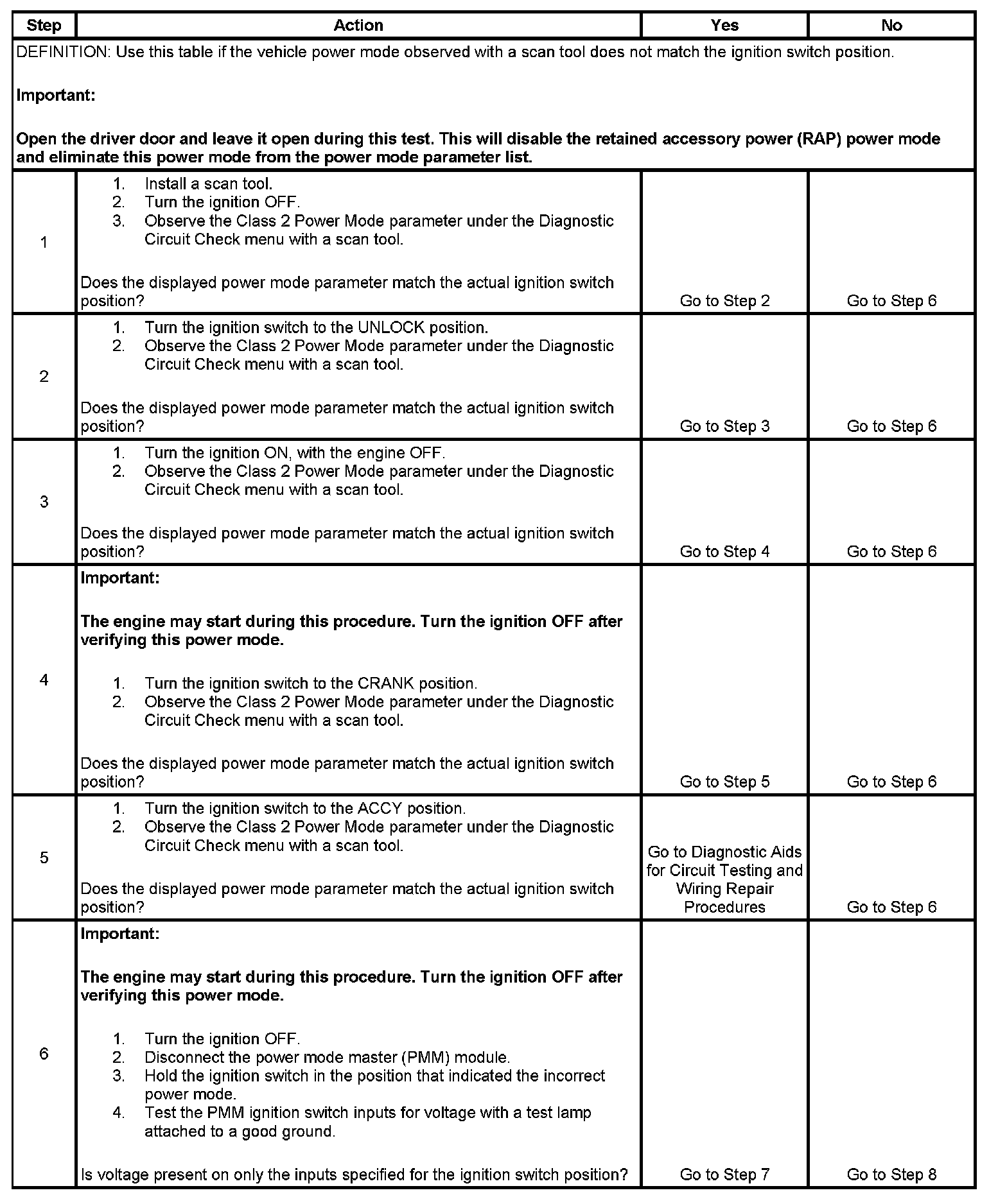 Normal vehicle class 2 communications and module operations will not begin until the system power mode has been identified. Discrete wires from the ignition switch contacts are monitored by the power mode master (PMM) module in order to determine the correct power mode. The PMM communicates the system power mode to all class 2 modules on the class 2 serial data line. Refer to Body Control System Description and Operation to identify which module is the PMM and the applicable power mode look up table.