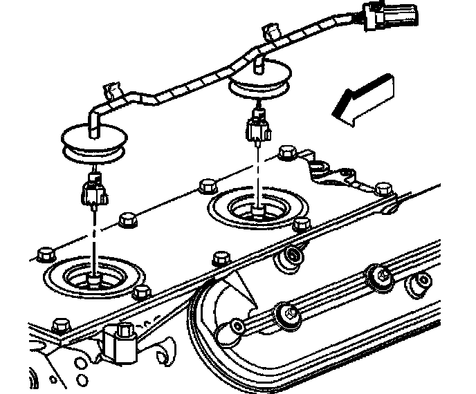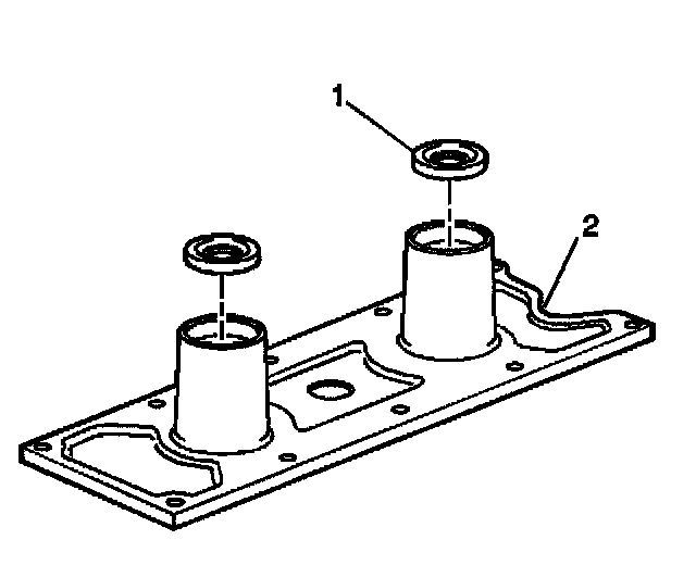2. Install the knock sensor oil seals (1) into the engine valley cover (2).