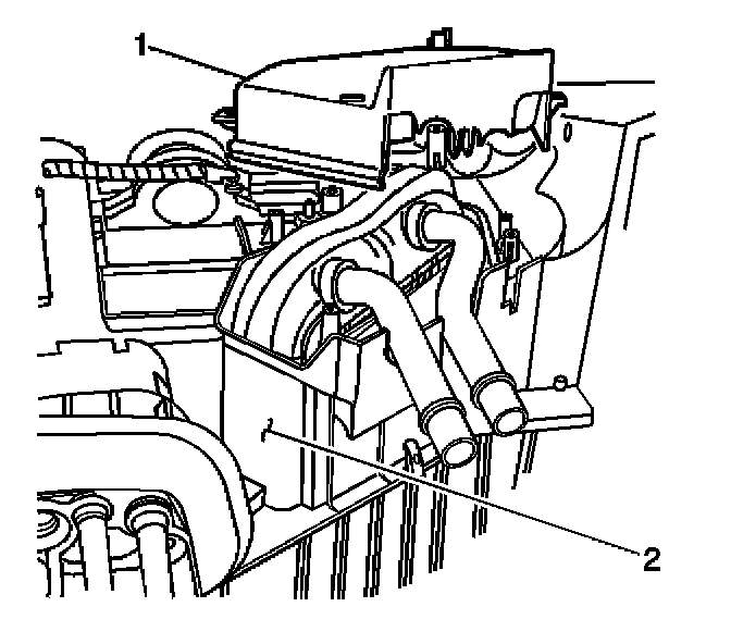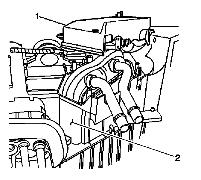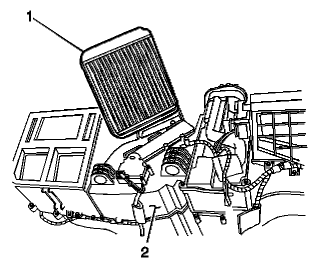 3. Remove the heater core cover (1) from the HVAC module assembly (2).