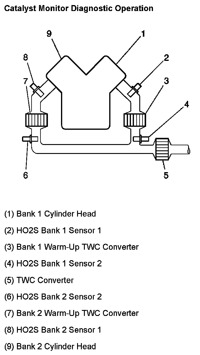 The OBD 2 catalyst monitor diagnostic measures the oxygen storage capacity of the 3-way catalytic converter (TWC). Heated oxygen sensors (HO2S) are used to monitor exhaust gas oxygen content. The HO2S 1 or pre-catalyst sensor is installed before the TWC converter. The HO2S 2 or post-catalyst sensor is installed after the TWC converter. Voltage variations between the sensors allow the PCM to determine the performance of the TWC catalyst. When the TWC catalyst becomes less effective in promoting chemical reactions, the catalyst capacity to store and release oxygen is generally degraded. The OBD 2 catalyst monitor diagnostic is based on a correlation between the conversion efficiency of the TWC converter catalyst and the oxygen storage capacity of the catalyst. A good catalyst, e.g. 95 percent hydrocarbon conversion efficiency, will show a relatively flat output voltage on the post-catalyst HO2S. A degraded catalyst, 65 percent hydrocarbon conversion, will show greatly increased activity in the output voltage from the post catalyst HO2S.