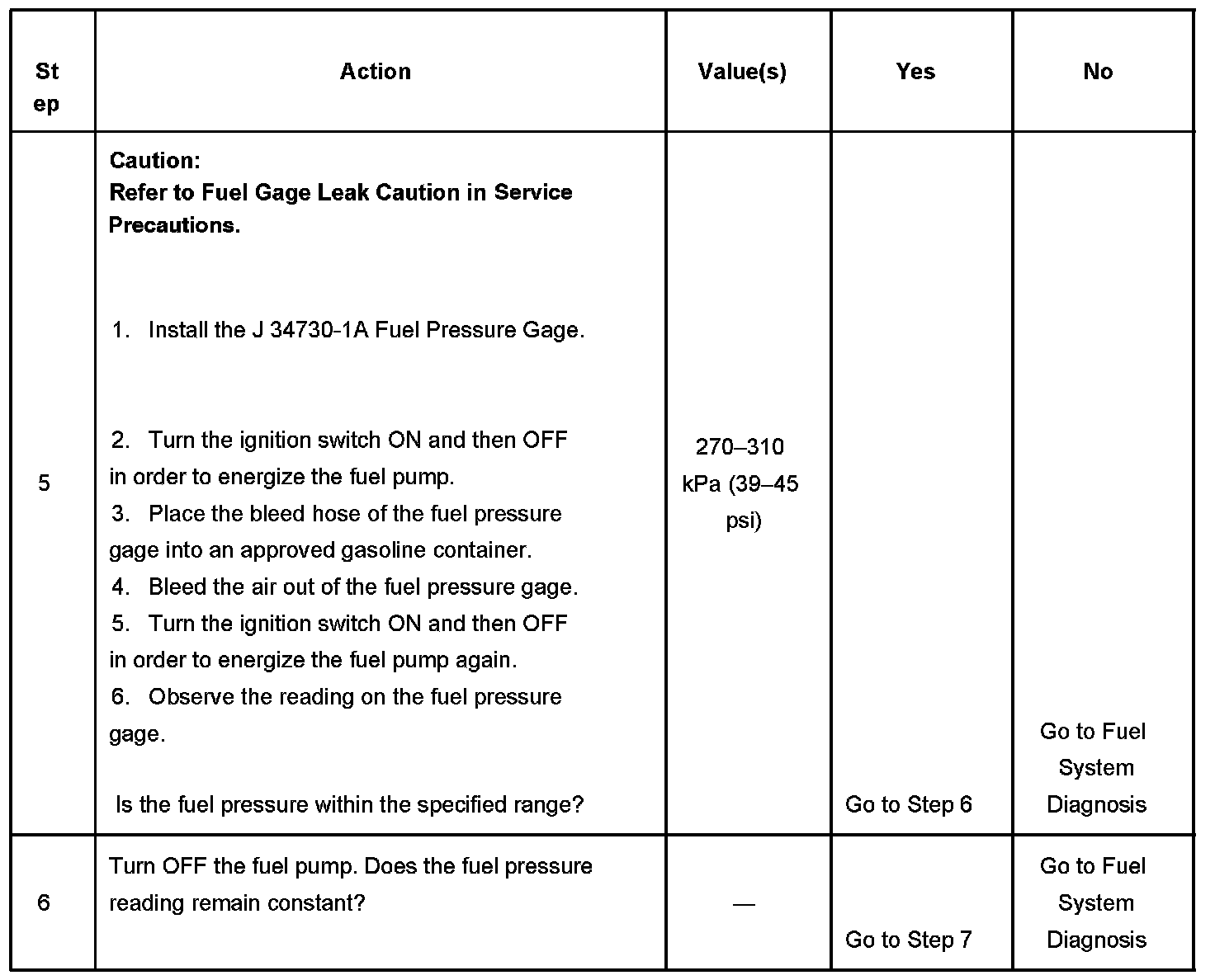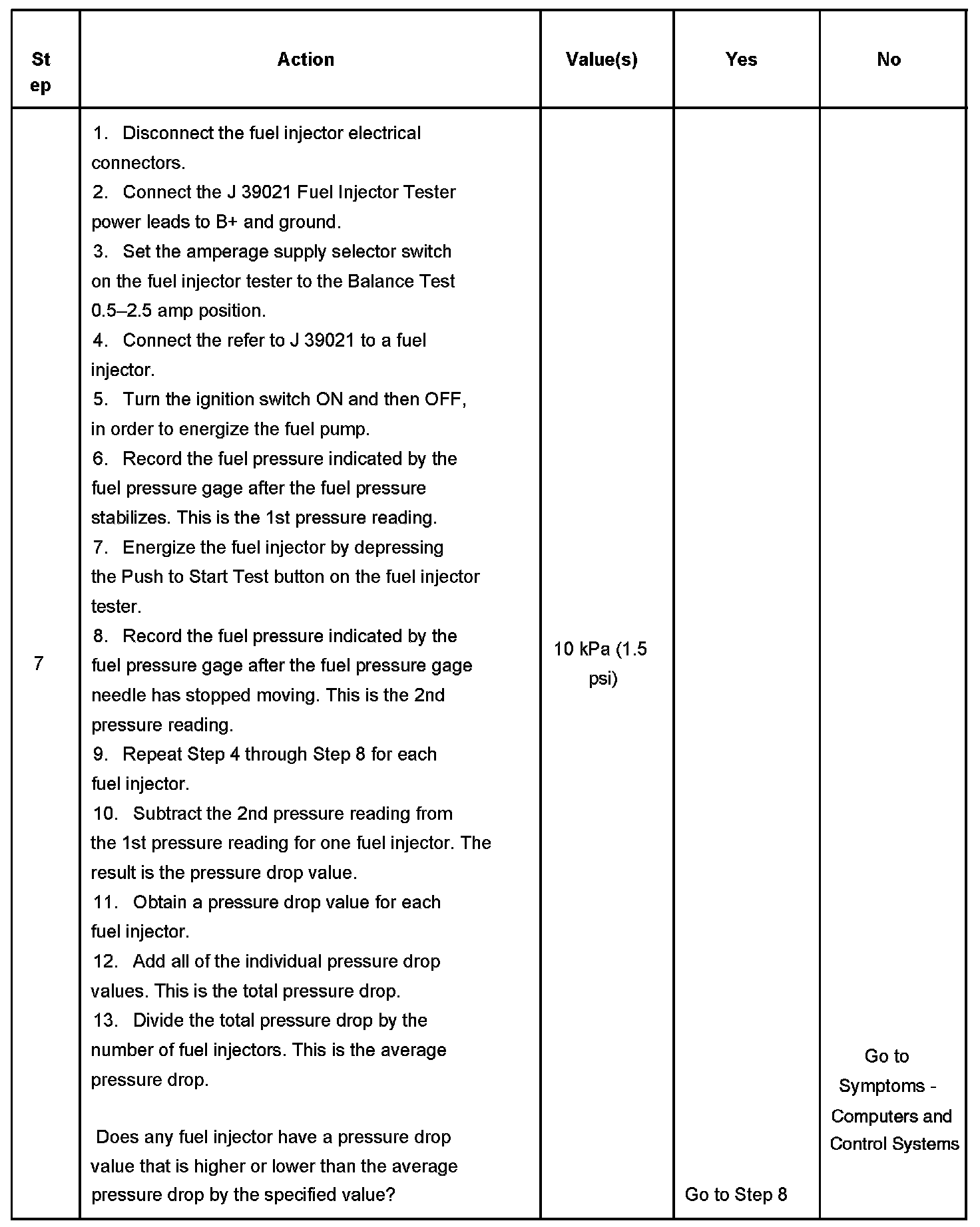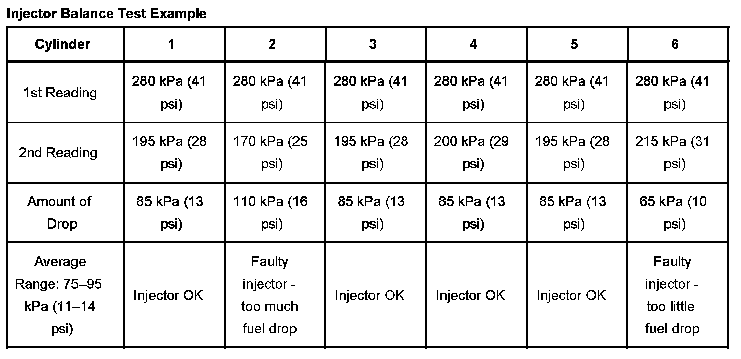 7. The fuel injectors are flowing properly if the pressure drop value for each fuel injector is within 10 kPa (1.5 psi) of the average pressure drop value. Calculate the pressure drop value for each fuel injector by subtracting the second pressure reading from the first pressure reading. Refer to the examples in the preceding table.