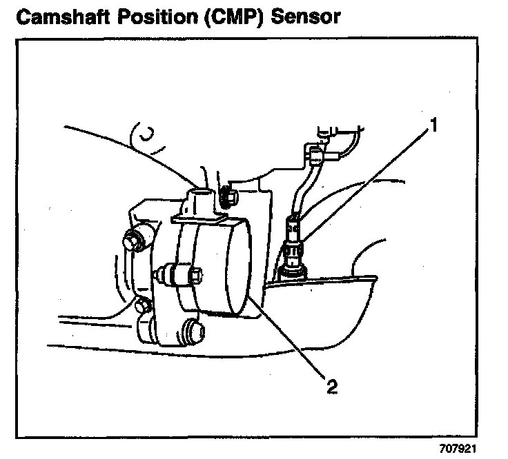 The camshaft position (CMP) sensor (2) is located in a distributor style housing at the rear of the bank 1 cylinder head. The PCM uses the CMP sensor input in order to control the fuel injectors and the ignition timing. The CMP sensor is adjustable.