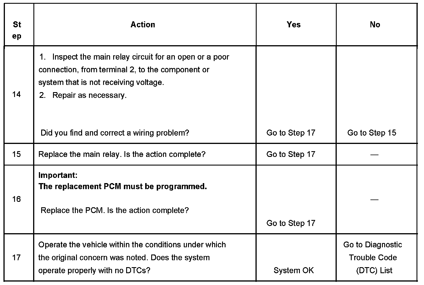 9. This step checks for ignition positive voltage at the PCM. The PCM will not operate the main relay if there is no power to terminal 20.