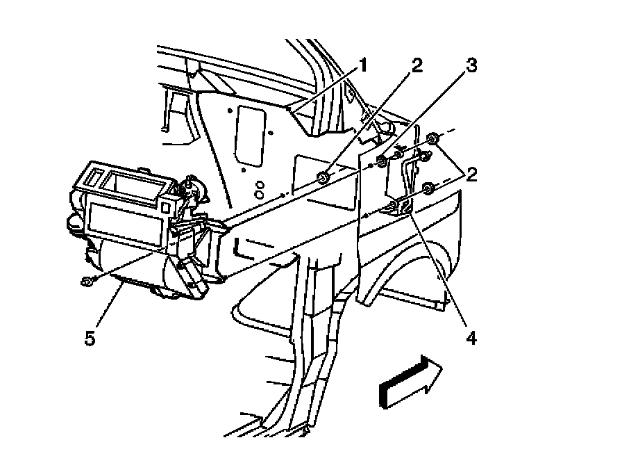 10. Remove the heater case (5) from the vehicle.