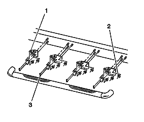 1. Remove 8 nuts (1) and 4 U-bolts (3) securing the assist step assembly to the mounting brackets.