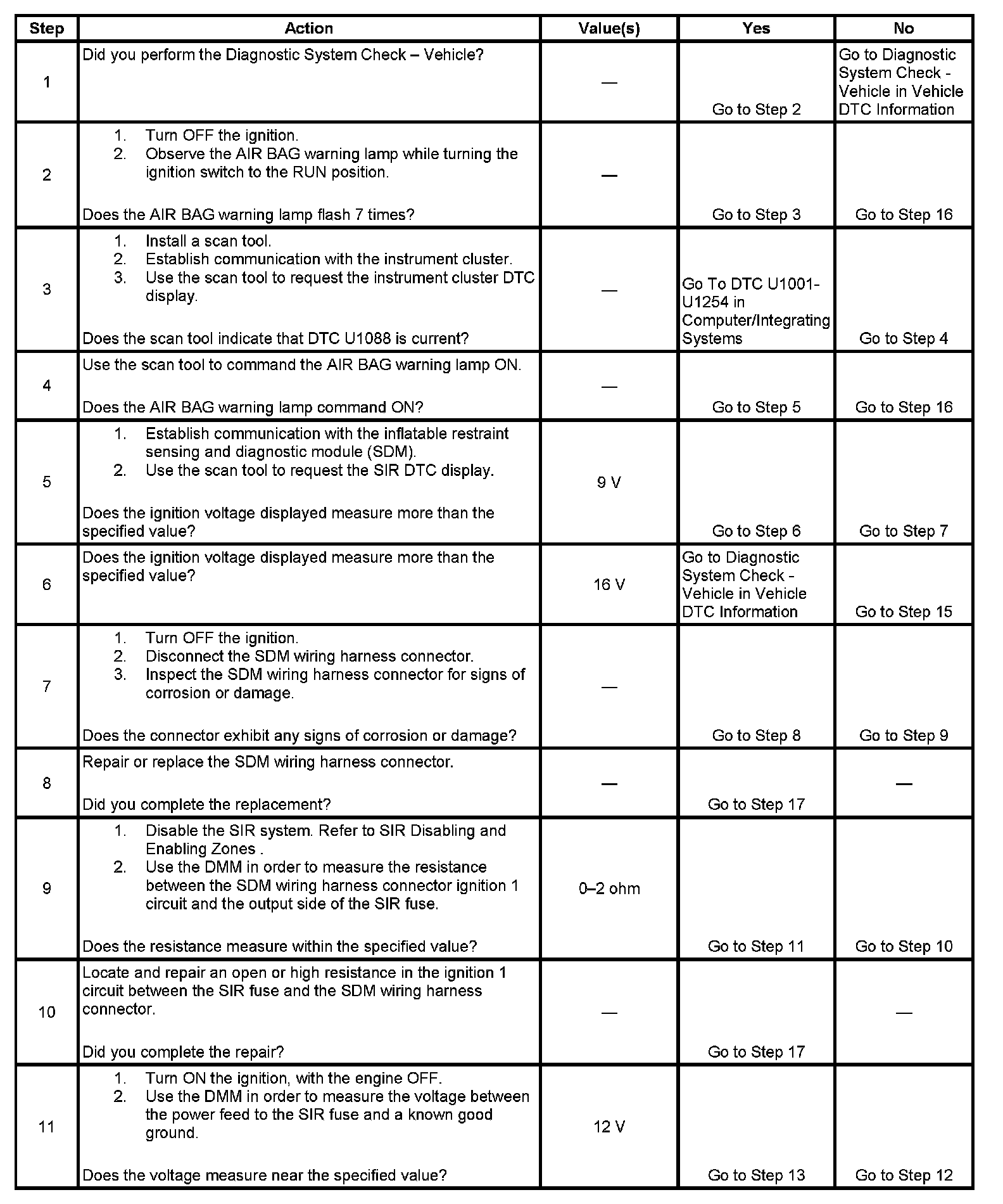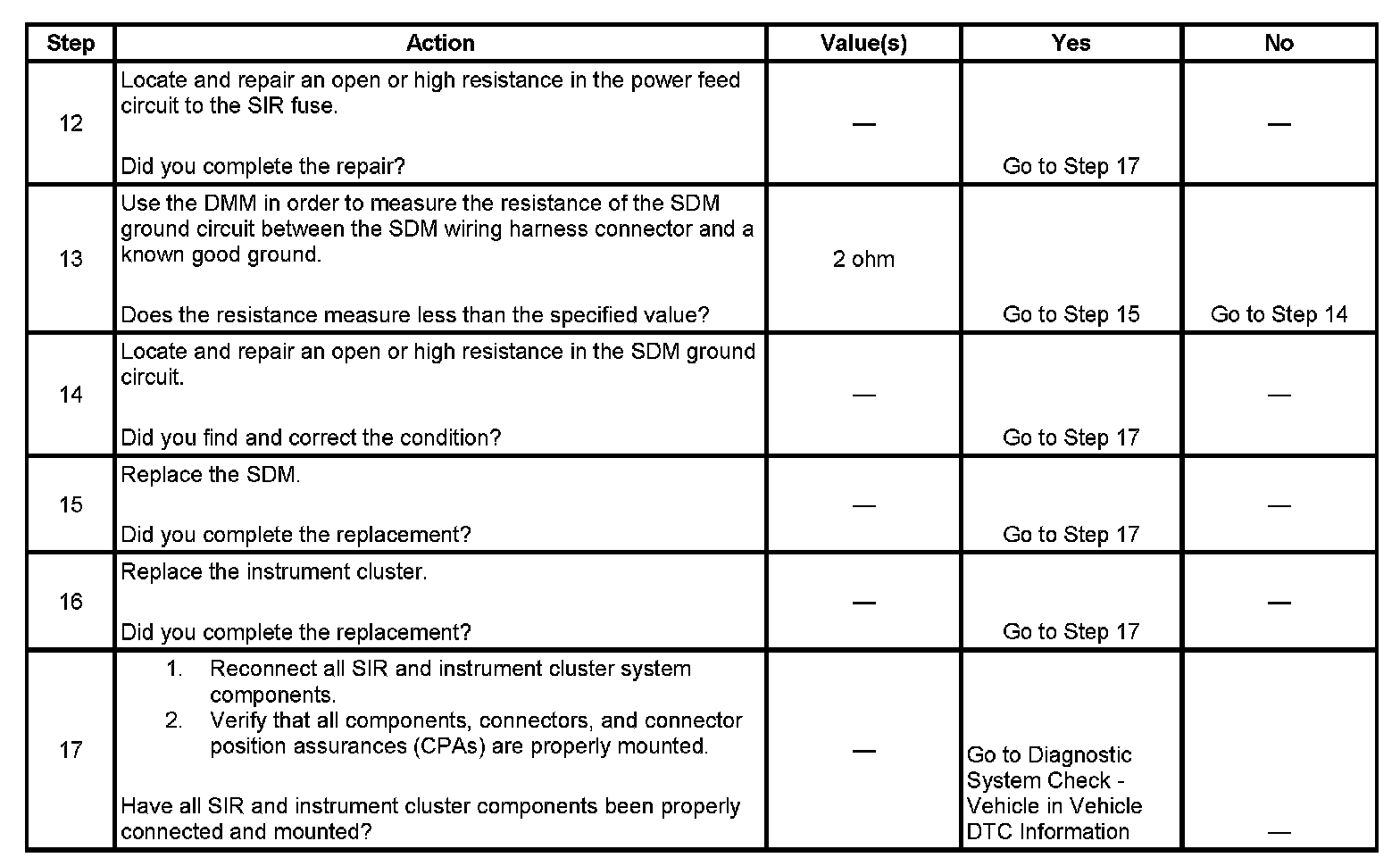 9. This step tests for an open or high resistance in the ignition 1 voltage circuit between the SDM and the SIR fuse.
