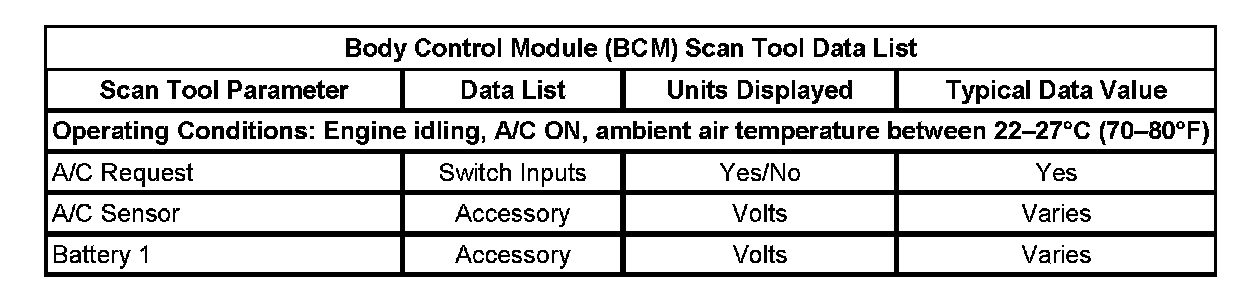 Use the Scan Tool Data Display Values and Definitions Information in order to assist in diagnosing the HVAC Control Module problems. Compare the vehicles actual scan tool data with the typical data display value table information. Use the data information in order to aid in understanding the nature of the problem when the vehicle does not match with the typical data display values.