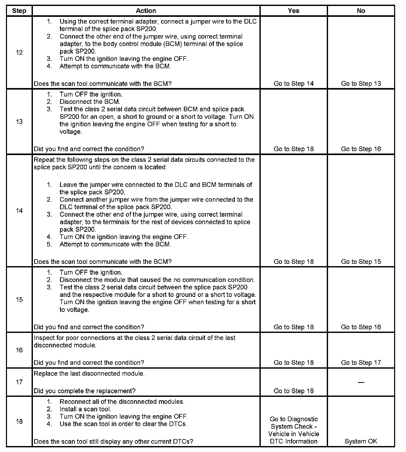 12. The class 2 serial data circuit is shorted to voltage or ground. The condition may be due to the wiring or due to a malfunction in one of the modules. When testing the wire for a short, make sure there is not a module connected to the wire being tested. This test isolates the BCM class 2 serial data circuit.