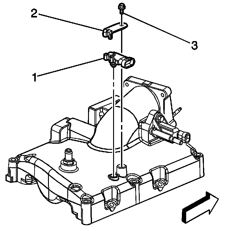 3. Remove the MAP sensor (1) and the MAP sensor port seal if it is still retained in the intake manifold.