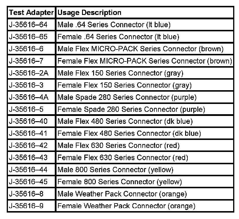 NOTE: Do not insert test equipment probes into any connector or fuse block terminal. The diameter of the test probes will deform most terminals. A deformed terminal can cause a poor connection, which can result in system failures. Always use the J 35616-B Connector Test Adapter Kit or the J 42675 Flat Wire Probe Adapter Kit in order to frontprobe terminals. Do not use paper clips or other substitutes as they can damage terminals and cause incorrect measurements.