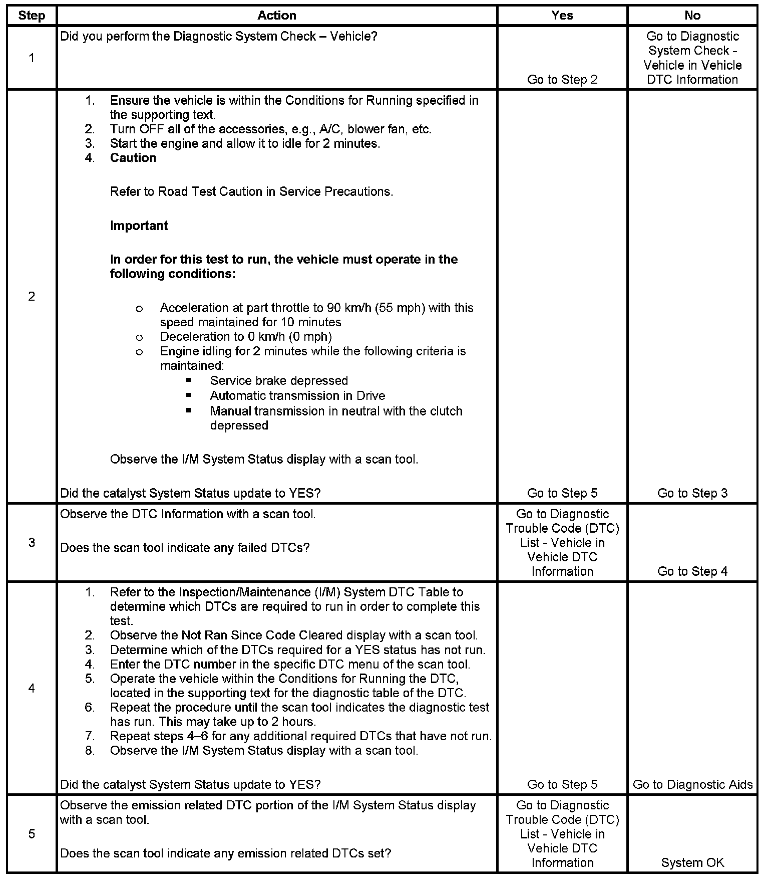 The purpose of this test is to satisfy the enable criteria necessary to execute inspection/maintenance (I/M) readiness diagnostics for the catalyst system. The test may be used to set the I/M System Status indicators to YES. The I/M System Status display on the scan tool provides an indication of whether the control module has completed the required tests. The I/M System Status does not indicate that the tests have passed or failed. When all of the diagnostics for a specific system have run and passed, the I/M System Status will update to YES. If a test for a specific system has failed, the I/M System Status will update to YES, indicating a determination was made even if all of the other tests for that system have not run.
