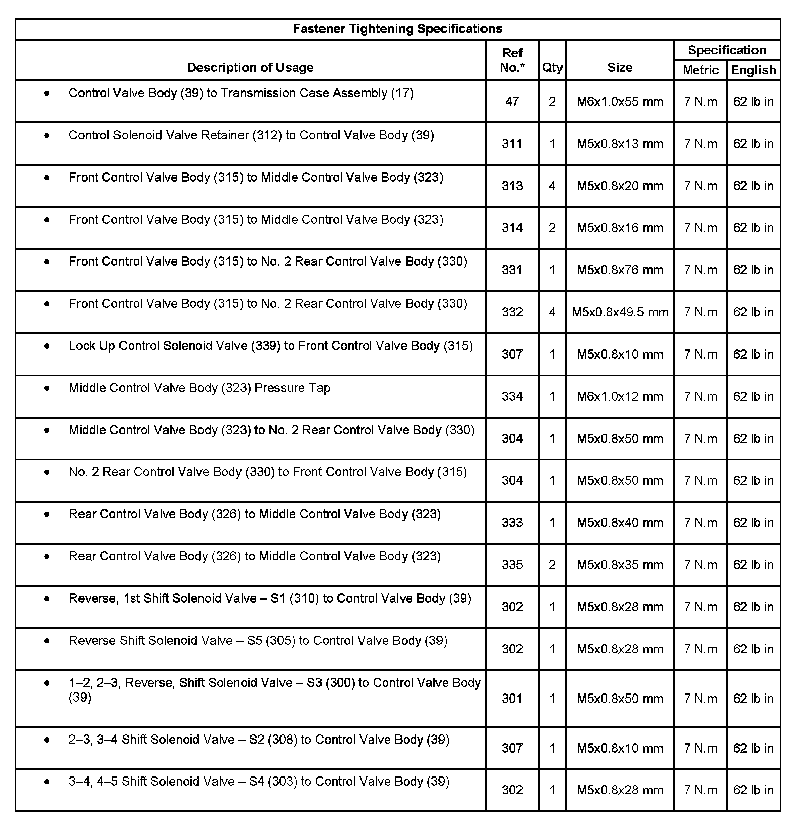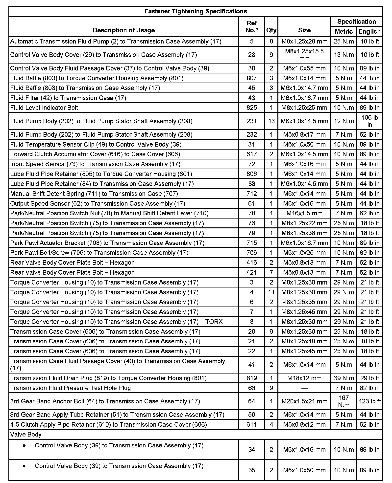 Fastener Tightening Specifications: