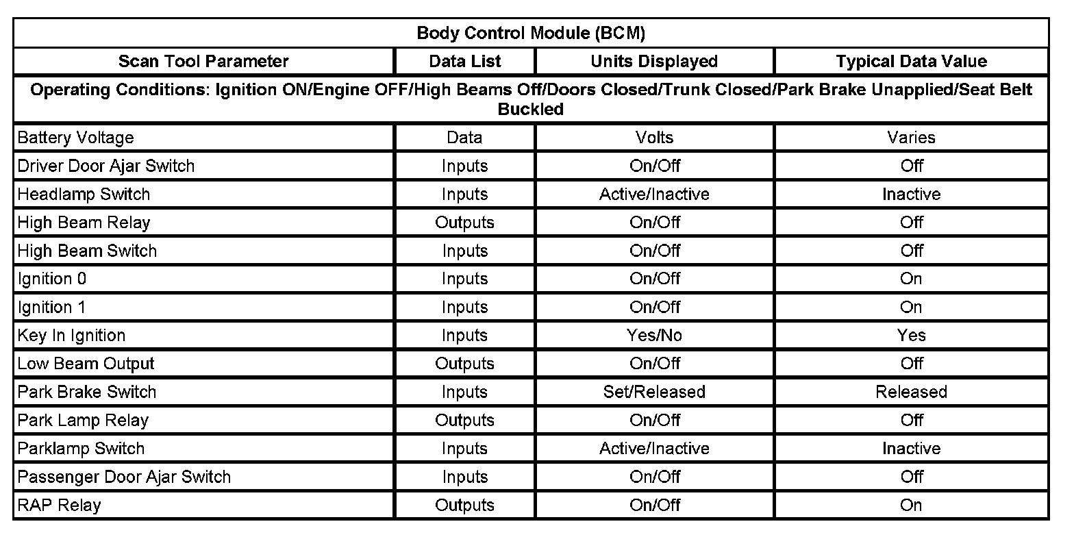 Scan Tool Data List - Body Control Module (BCM)