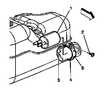 1. Install the fuel filter (1) into the bracket. Ensure that the fuel filter inlet tube is engaged in the fuel tank bracket orientation slot (5).