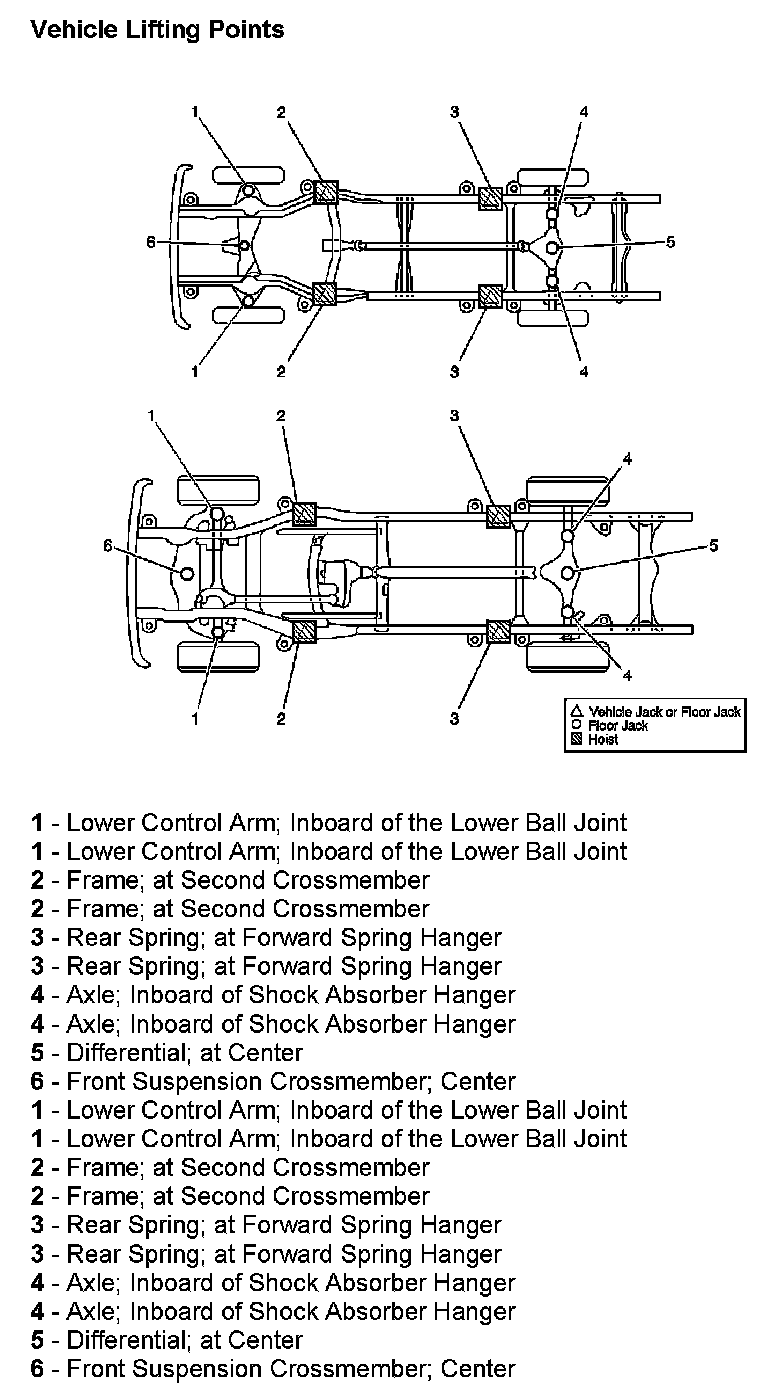 The jack and hoist lift points for the front of the vehicle are located between the front body mounts and the transmission crossmember. The jack and hoist lift points for the rear of the vehicle are located at the front hangers for the rear springs.