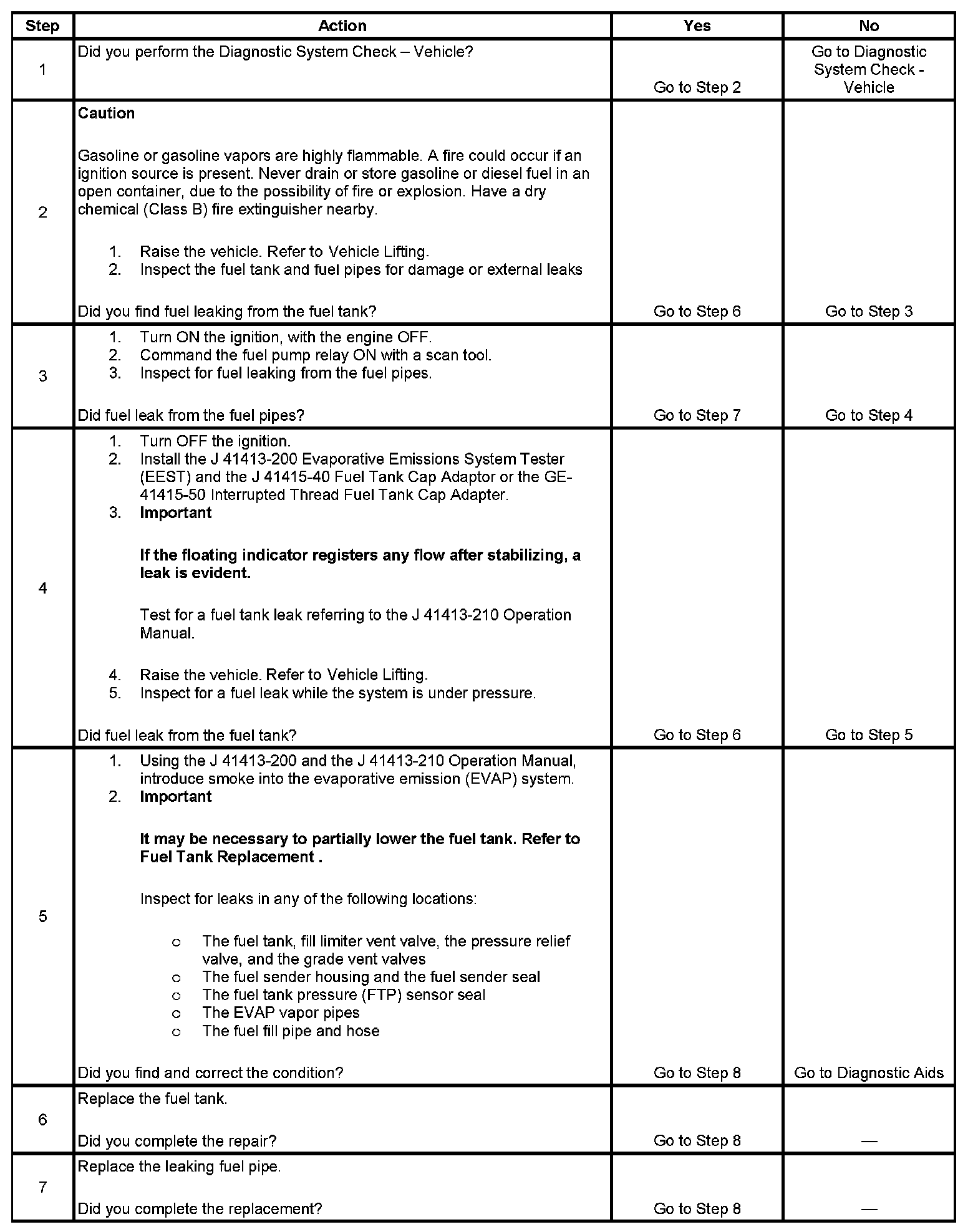 The fuel tank leak test is used to locate any fuel or fuel vapor escaping the fuel tank area. Fuel vapors escaping above the fuel level will be detected when the evaporative emission (EVAP) diagnostics complete one test cycle. The malfunction indicator lamp (MIL) will illuminate after the EVAP diagnostics have failed two test cycles.