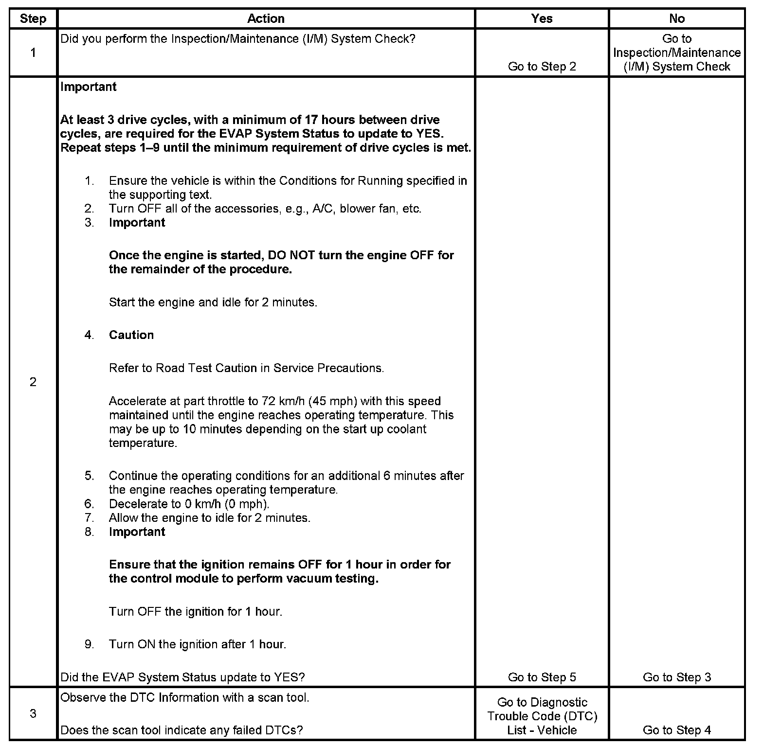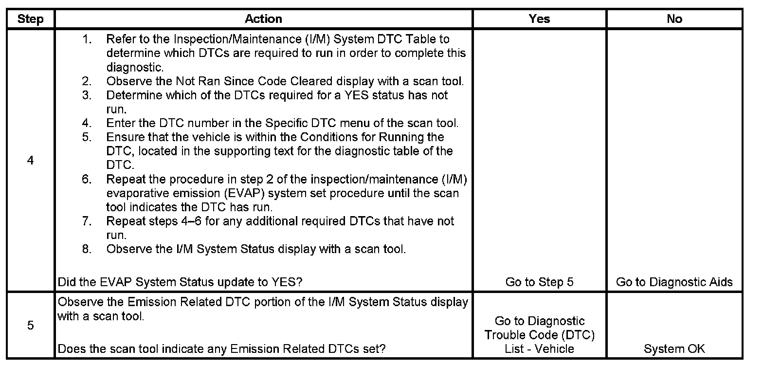 The purpose of this procedure is to satisfy the enable criteria necessary to execute inspection/maintenance (I/M) readiness diagnostics for the Evaporative Emission (EVAP) System. The procedure may be used to set the EVAP I/M System Status display on the scan tool to YES. The EVAP I/M System Status display indicates whether or not the control module has completed the readiness diagnostics. The readiness diagnostics complete when all DTCs comprising the diagnostics run and pass, or any DTC comprising the diagnostics illuminates the malfunction indicator lamp (MIL). If the diagnostics pass during one drive cycle, seventeen hours must elapse, regardless of whether the vehicle is driven or not. Then, the diagnostics will run again during the next drive cycle in which the conditions for running are met. Once the diagnostics have passed during the third drive cycle, the EVAP I/M System Status display will be updated to YES. A failed or aborted diagnostic will require the vehicle to cool down in order to meet the enable criteria for another drive cycle. Therefore, performing a visual inspection prior to running the EVAP test may prevent having to repeat the drive cycle.