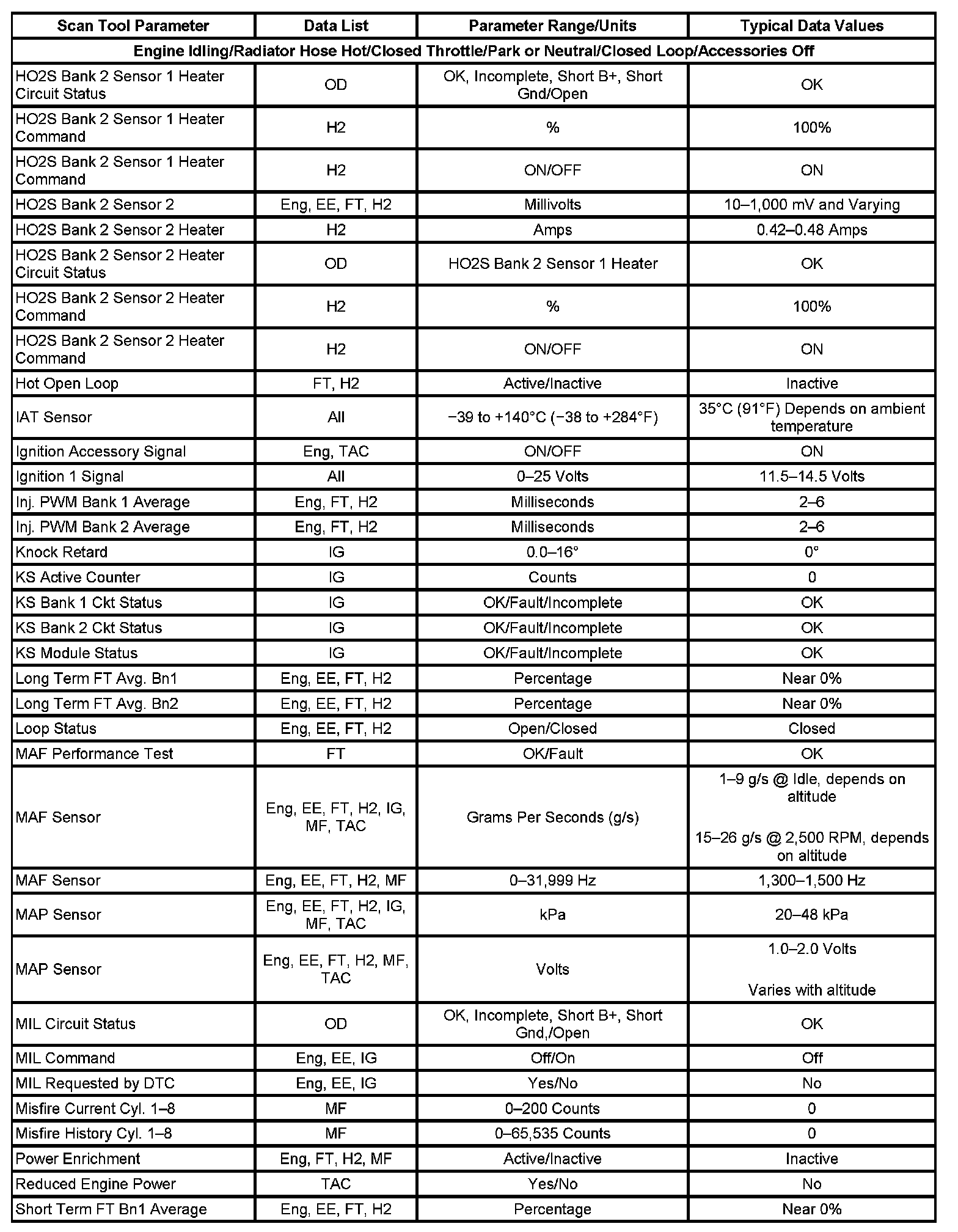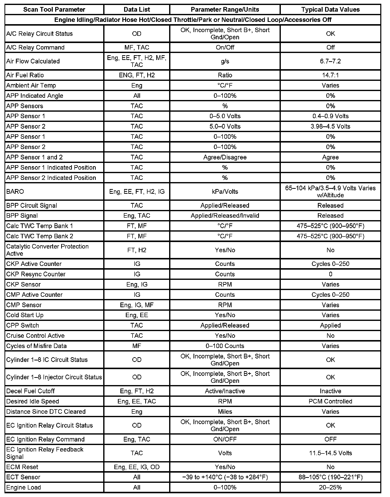 Scan tool values from a properly running engine may be used for comparison with the engine you are diagnosing. The Engine Scan Tool Data List represents values that would be seen on a normal running engine.