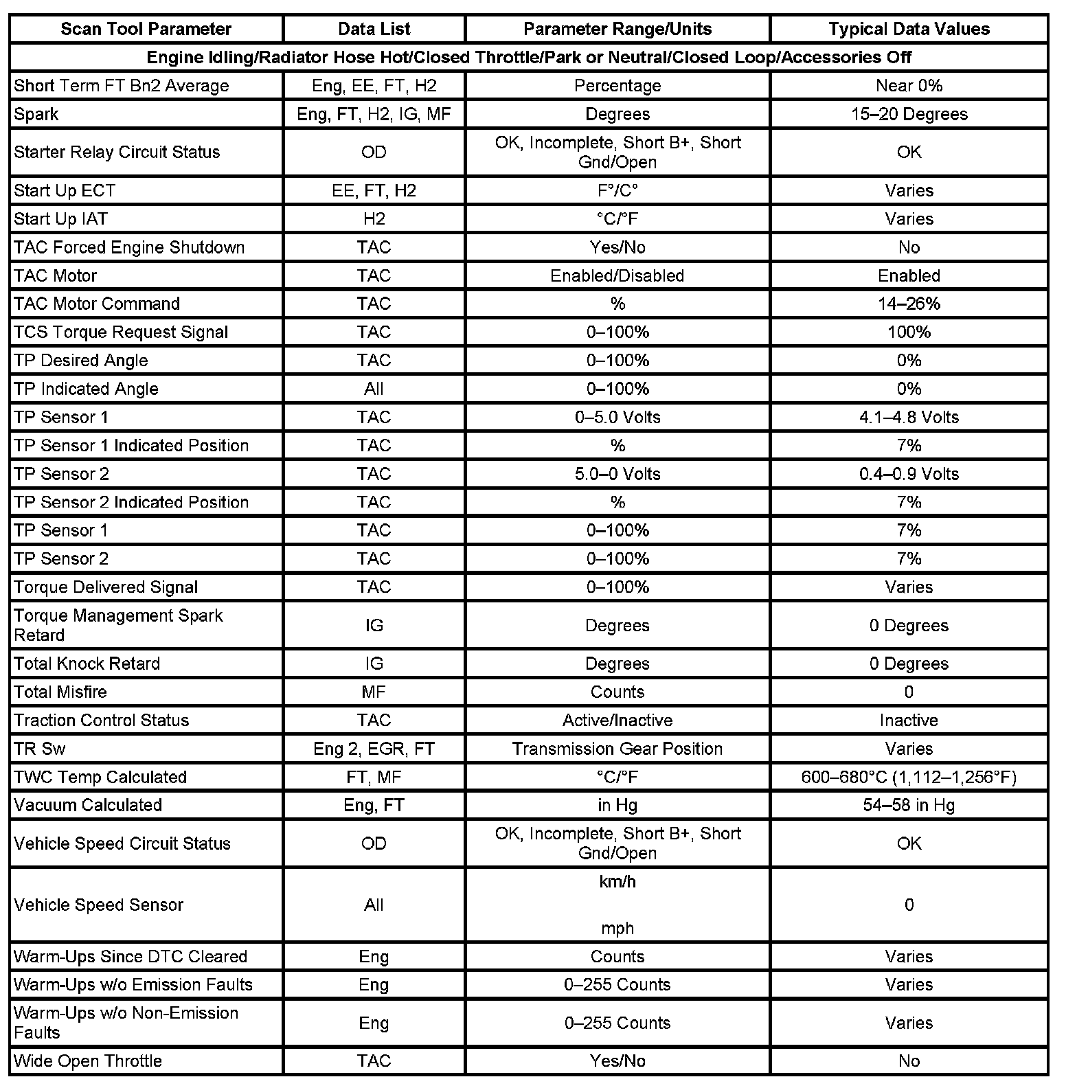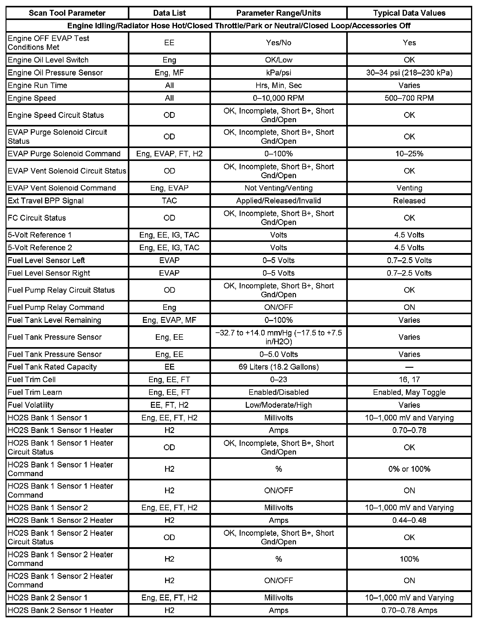 The Engine Scan Tool Data List contains all engine related parameters that are available on the scan tool. The list is arranged in alphabetical order. A given parameter may appear in any one of the data lists, and in some cases may appear more than once, or in more than one data list in order to group certain related parameters together.