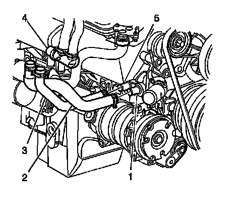 6. Remove the lower heater inlet hose clamp and the lower heater outlet hose clamp from the outlet of the coolant bypass valve (4) using the J 38185.