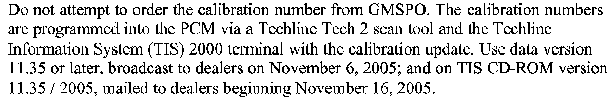 Do not attempt to order the calibration number from GMSPO. The calibration numbers are programmed into the PCM via a Techline TECH 2 scan tool and the Techline Information System (TIS) 2000 terminal with the calibration update. Use data version 11.35 or later, broadcasted to dealers on November 6, 2005; and on TIS CD-ROM version 11.35/2005, mailed to dealers beginning November 16, 2005. To complete this service procedure, the TECH 2 must also be updated to release 25.010 or greater. If you cannot access TECH 2 release 25.010 call the Techline Customer Support Center at 1-800-828-6860 and it will be provided.