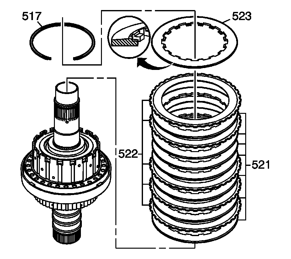 Assemble the 7 steel (521) and 5 new fiber 522) direct clutch plates into the input housing in alternating order beginning with a steel plate (521). Note the location of the 4th and 5th fiber plates. 3 steel plates will be installed together.
