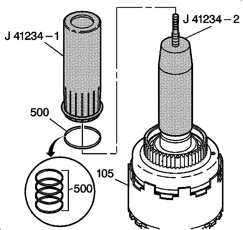 4. Compress the coast clutch return spring retainer (506). Use the J 41236 and J 23327 or equivalent.