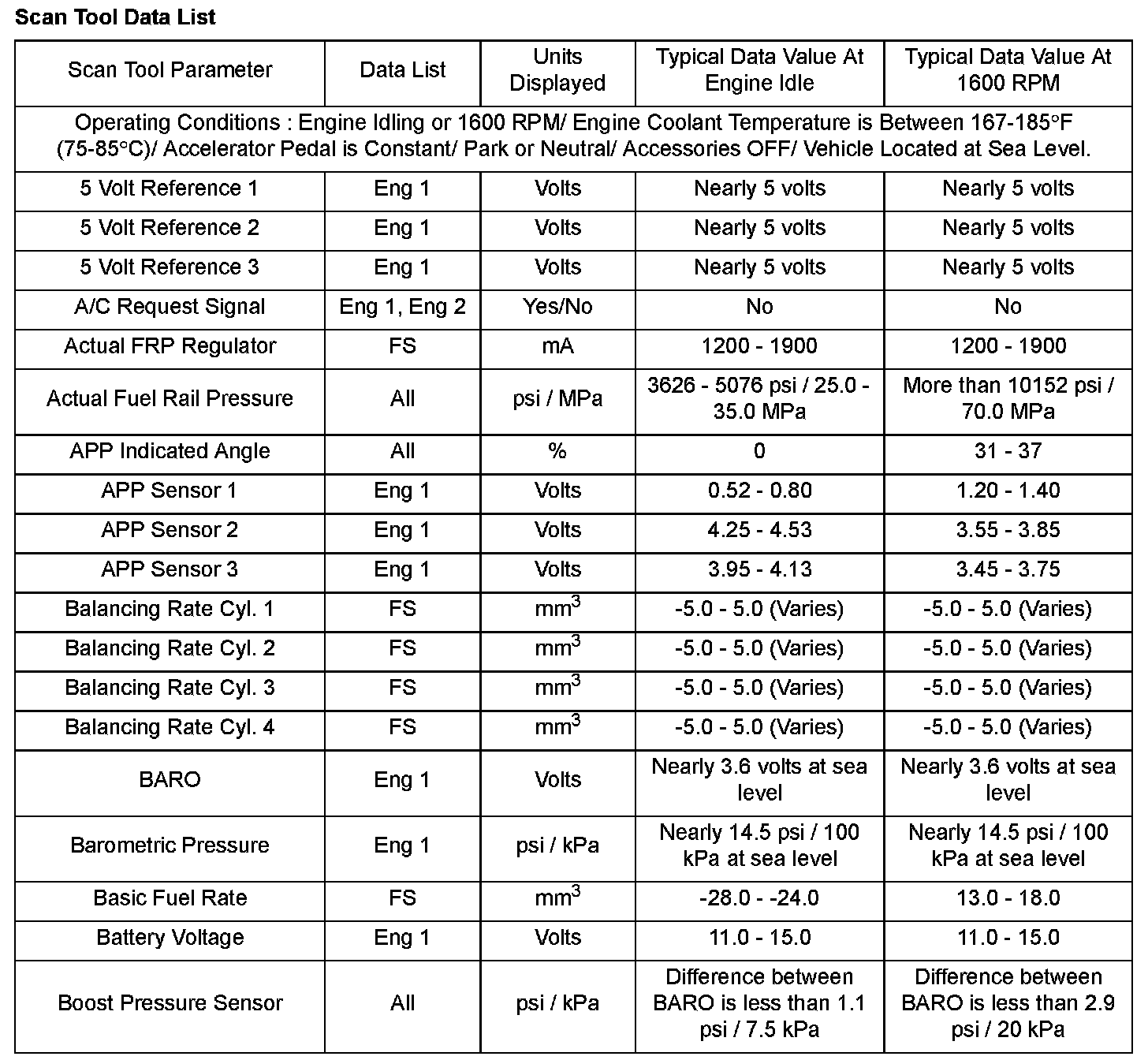 Scan tool values from a properly running engine may be used for comparison with the engine you are diagnosing. The Engine Scan Tool Data List represents values that would be seen on a normal running engine.