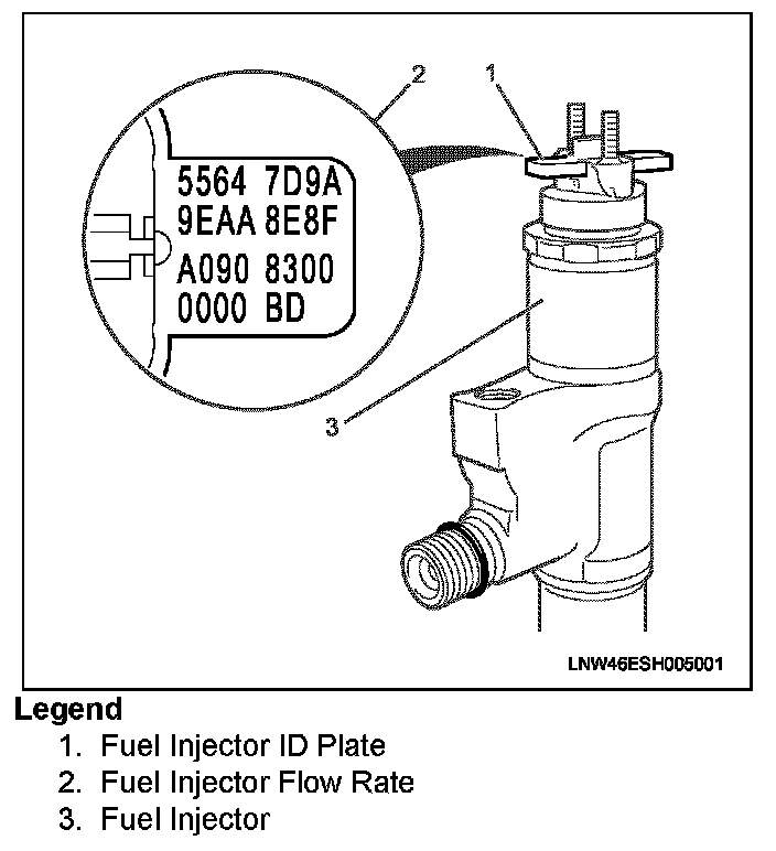 - Fuel Injector ID plate located on the top of each fuel injector. (Preferred Method) The correct order for the fuel injector flow rates for the following illustration are as follows: