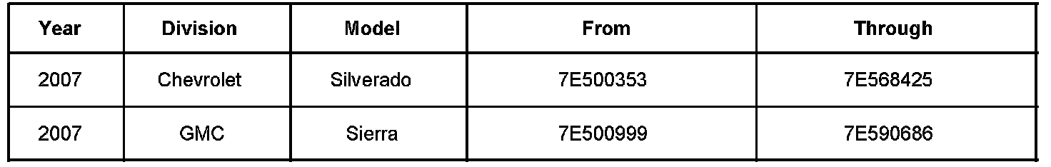 Involved are certain 2007 Chevrolet Silverado and GMC Sierra vehicles built within the VIN breakpoints shown.