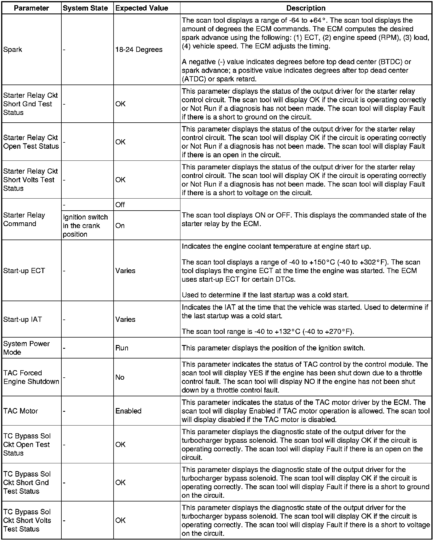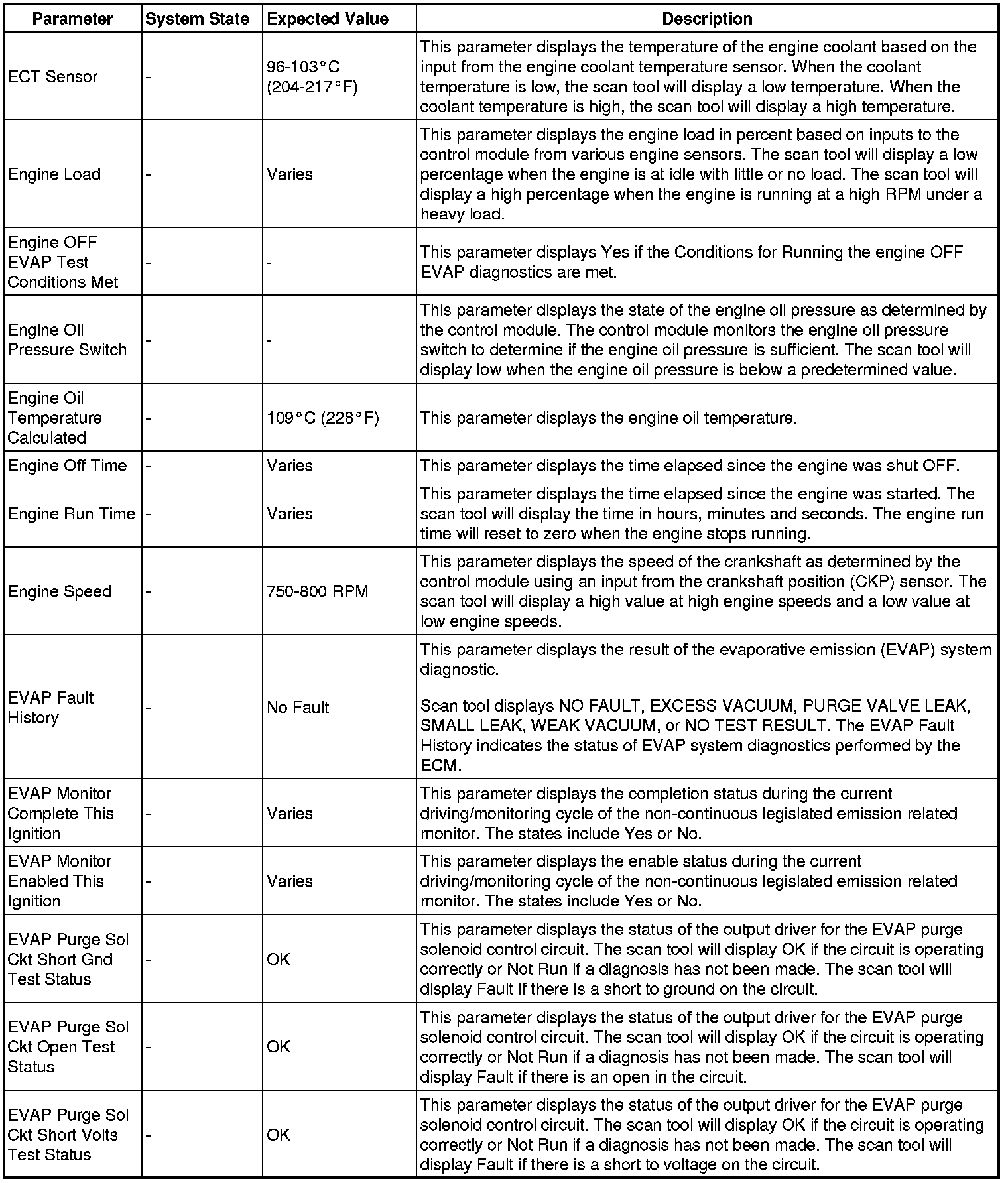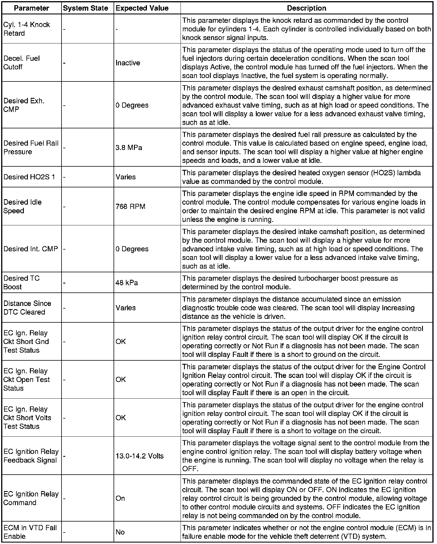 The Engine Control Module Scan Tool Data List contains all engine-related parameters that are available on the scan tool. The list is arranged in alphabetical order. A given parameter may appear in any one of the data lists, and in some cases may appear more than once, or in more than one data list in order to group certain related parameters together.