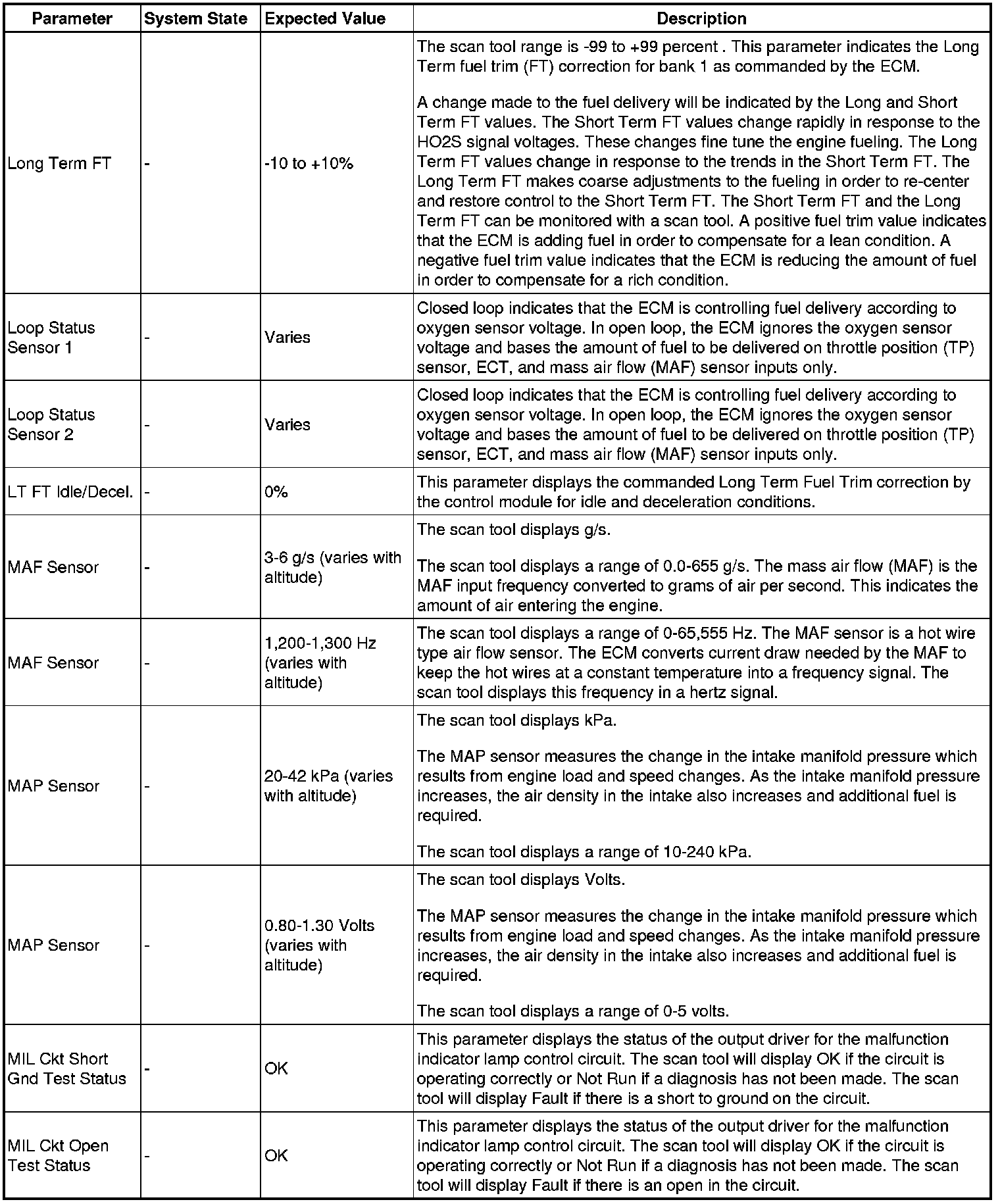 Only the parameters listed below are referenced in this service manual for use in diagnosis. If all values are within the typical range described below, refer to Symptoms - Engine Controls (- Symptoms - Engine Controls) for the 2.0L engine for diagnosis.