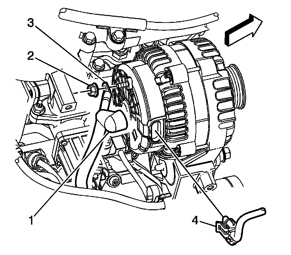 5. Remove the generator B+ terminal nut (2) and the electrical connector (4).