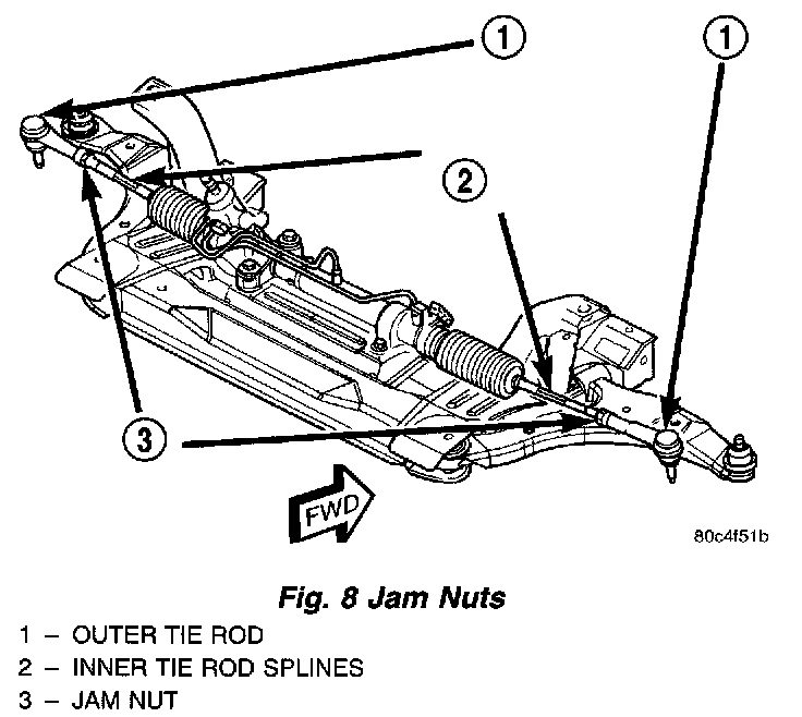 2. Loosen the tie rod adjusting jam nuts. Grasp each inner tie rod at its splines and rotate it one way or the other until the front wheel toe is set to the preferred specification.
