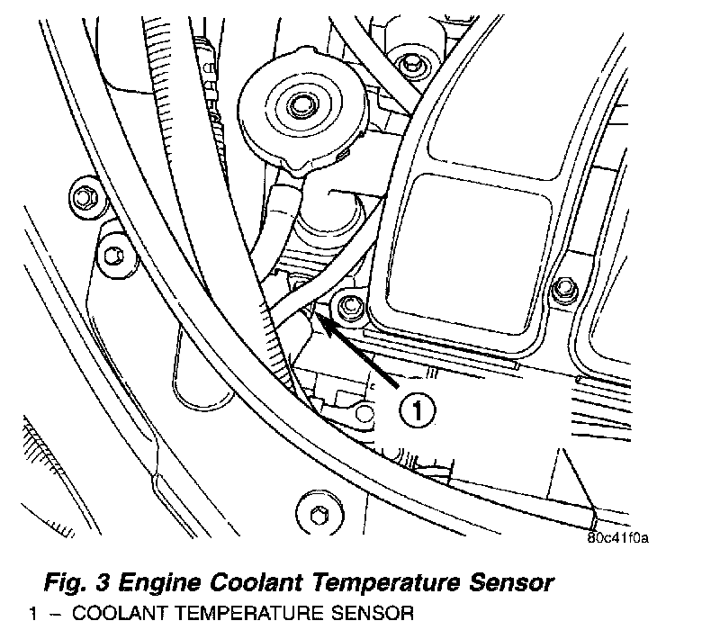 The coolant sensor threads into the front of the cylinder head near the radiator fill tube. New sensors have sealant applied to the threads.