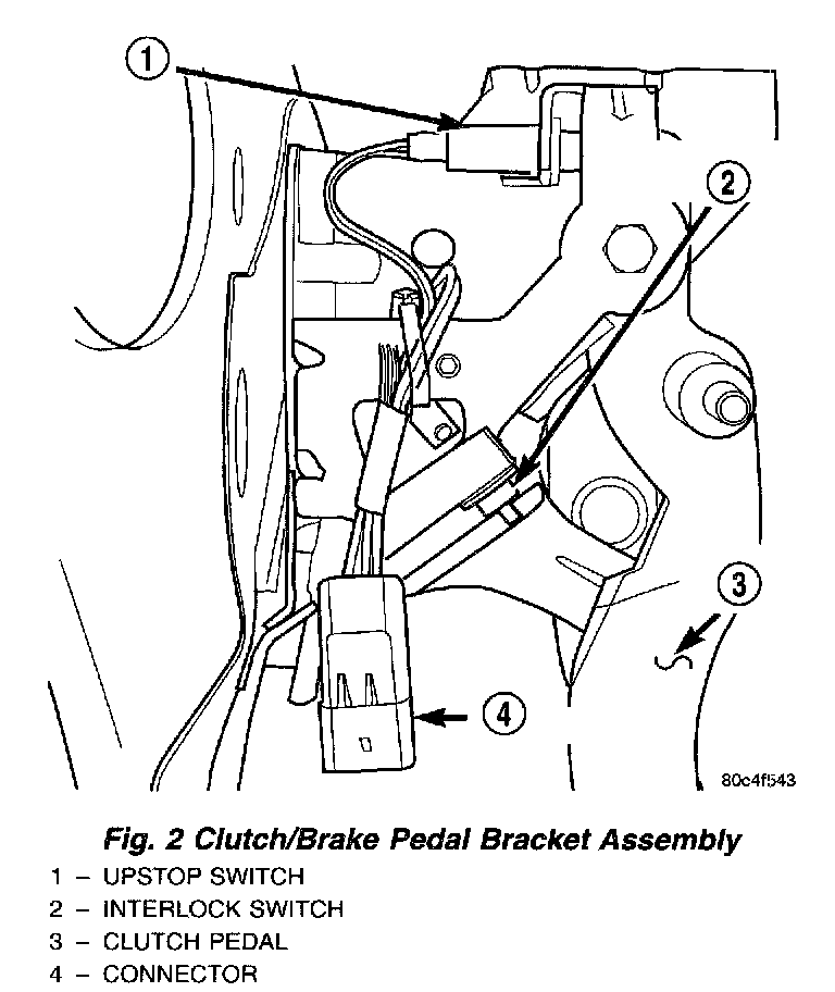 The clutch interlock/upstop switch is an assembly consisting of two switches: an engine starter inhibit switch (interlock) and a clutch pedal upstop switch. The switch assembly is located in the clutch/brake pedal bracket assembly, each switch being fastened by four plastic wing tabs.