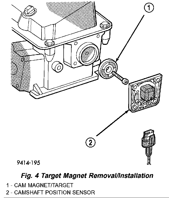 1. Install target magnet in end of camshaft. Tighten mounting screw to 3.6 Nm (32 ± 5 in. lbs.) torque. Over torqueing could cause cracks in magnet. If magnet cracks replace it.