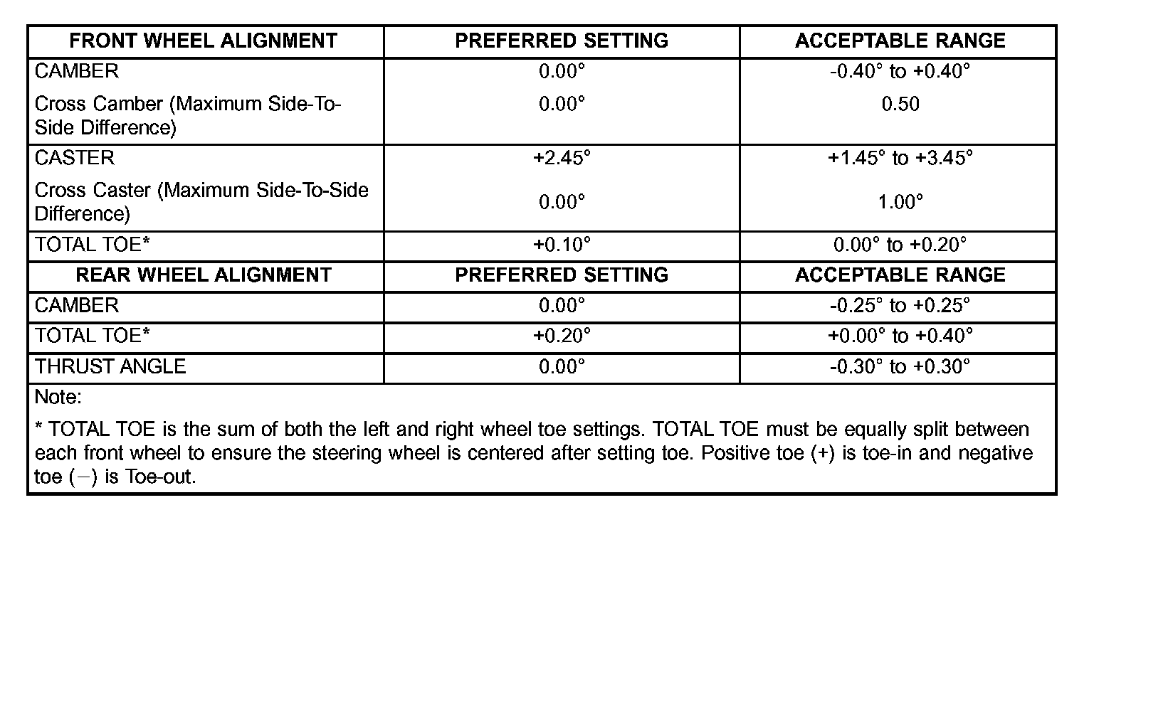 Front camber and caster settings on this vehicle are determined at the time the vehicle is designed, by the location of the vehicle's suspension components. This is referred to as Net Build. The result is no required adjustment of camber and caster after the vehicle is built or when servicing the suspension components. Thus, when performing a wheel alignment, caster and camber are not normally considered adjustable angles. Camber and caster should be checked to ensure they meet vehicle specifications.