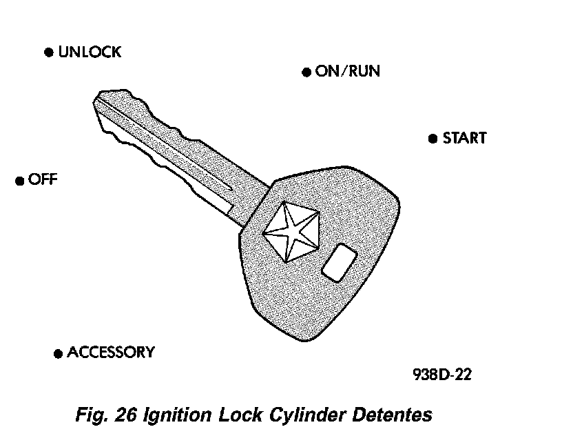 The lock cylinder is inserted in the end of the housing opposite the ignition switch. The ignition key rotates the cylinder to 5 different detents (Fig. 26):