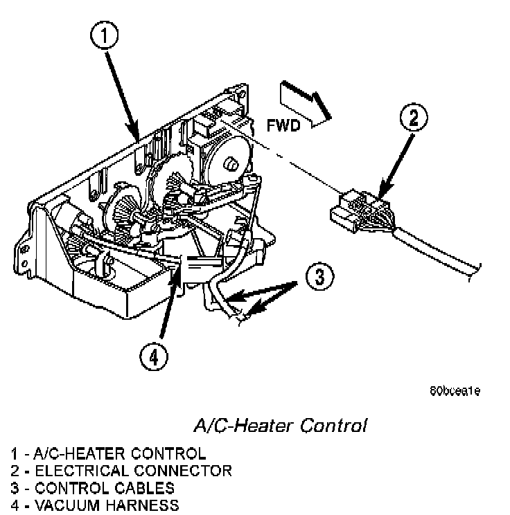 5. Disconnect the vacuum harness, control cables and wire harness from the A/C-heater control.
